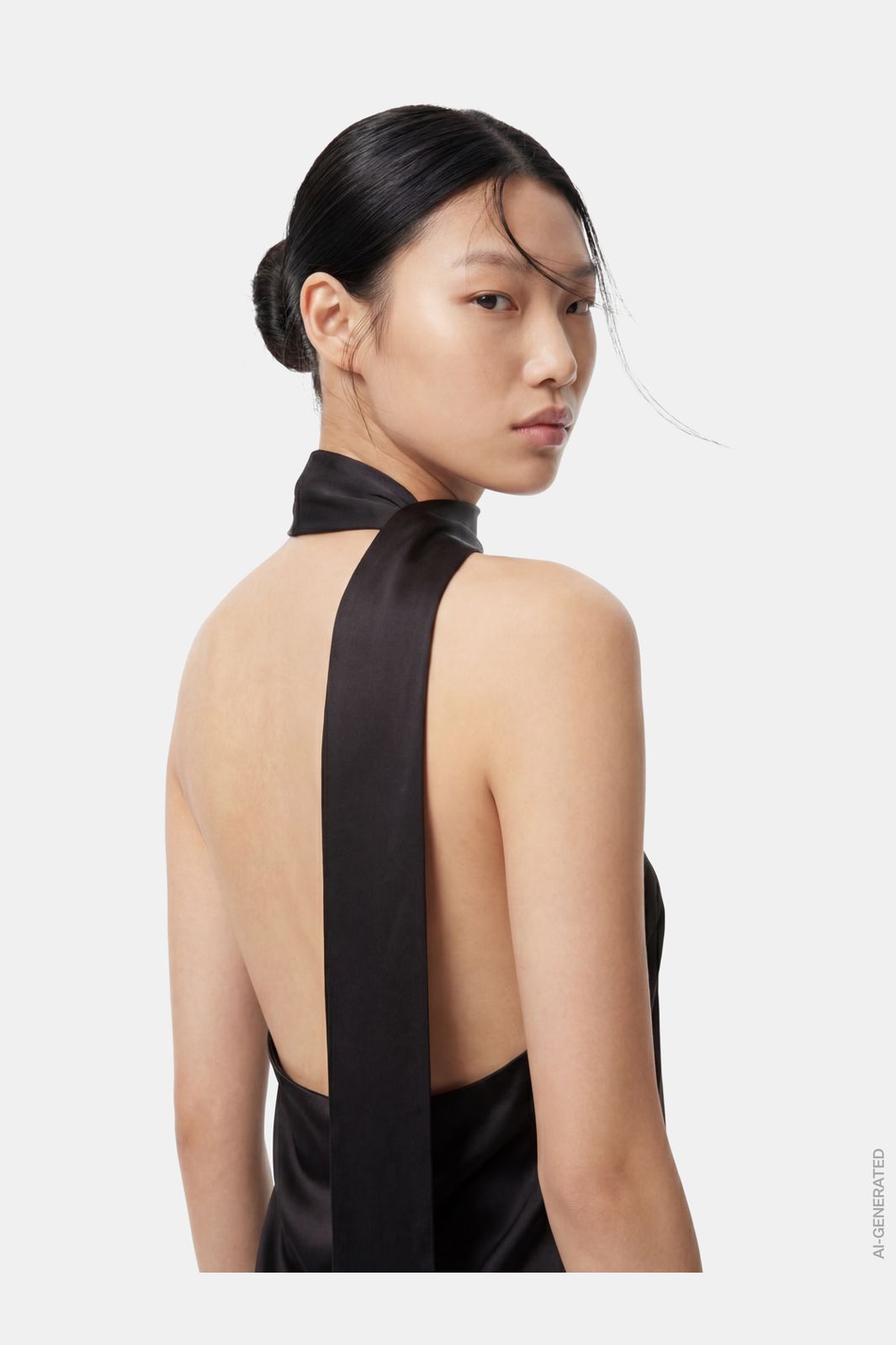 Svart satinklänning från Pieces med asymmetrisk design och knytband i halsen. Klänningen har en slät yta och passar både festliga och formella tillfällen.