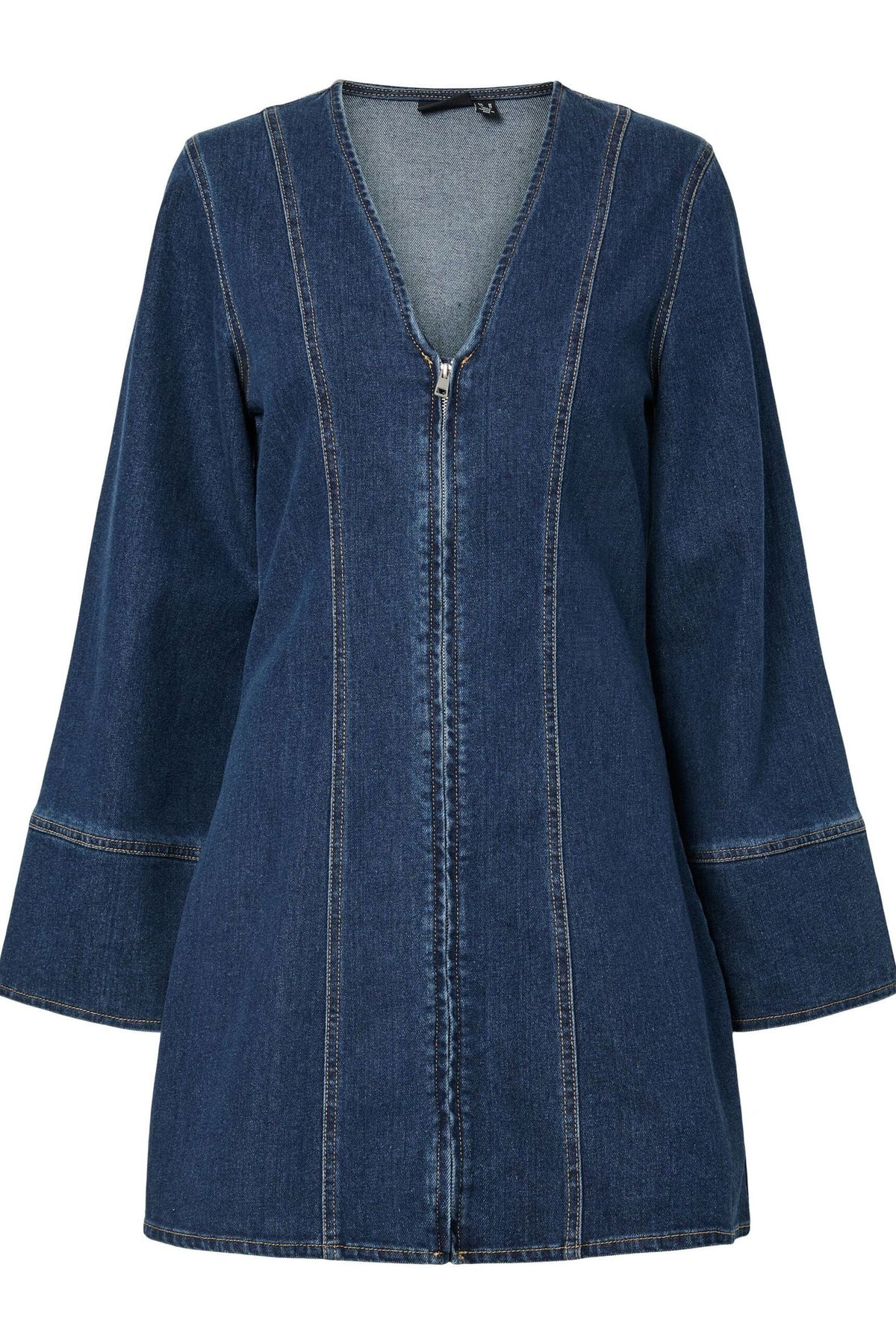 Denimklänning från Pieces i mörkblå denim med långa ärmar och rund hals. Klänningen har en regular fit och går till mitten av låret. De dekorativa sömmarna ger klänningen ett rustikt uttryck.