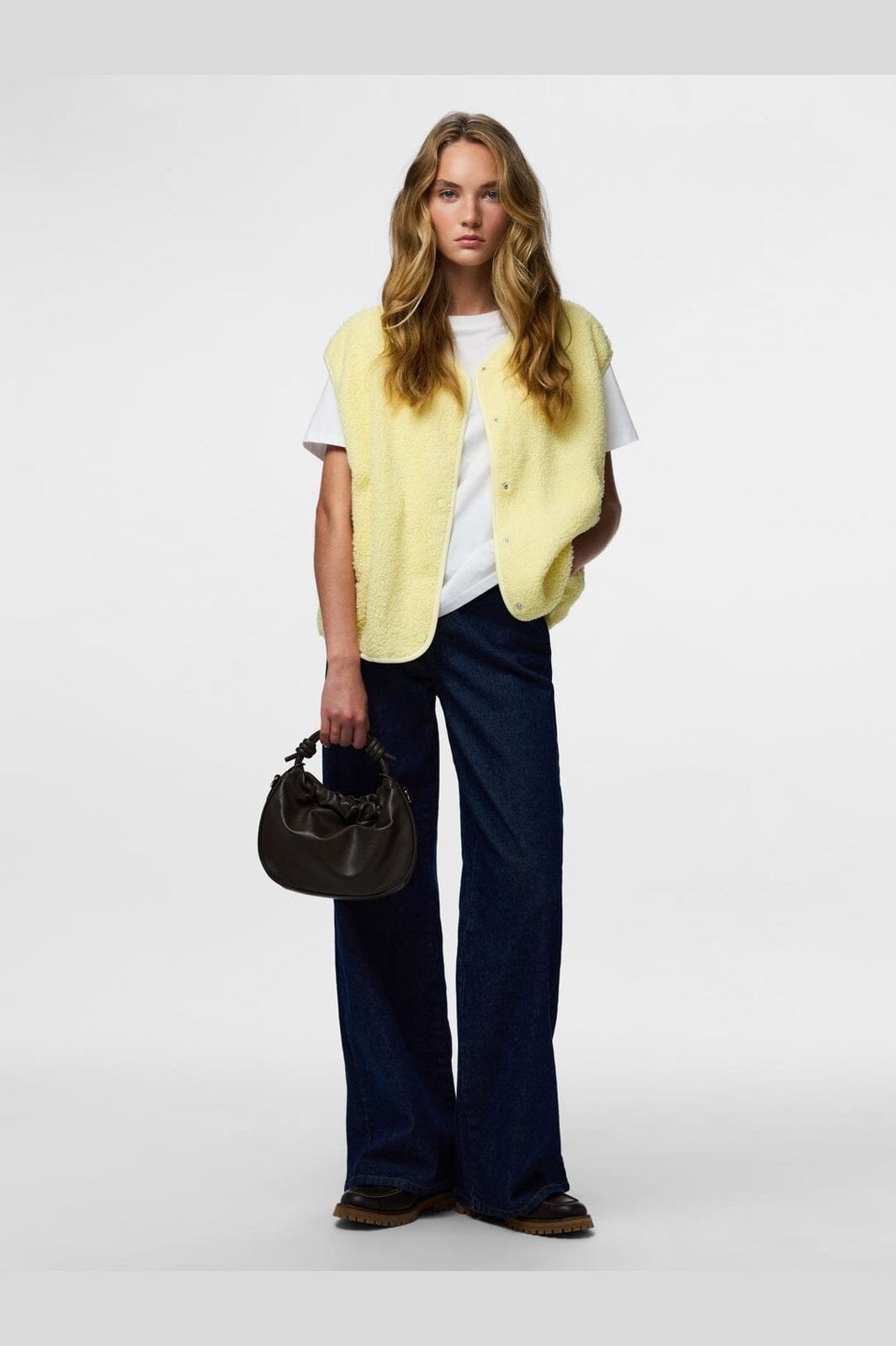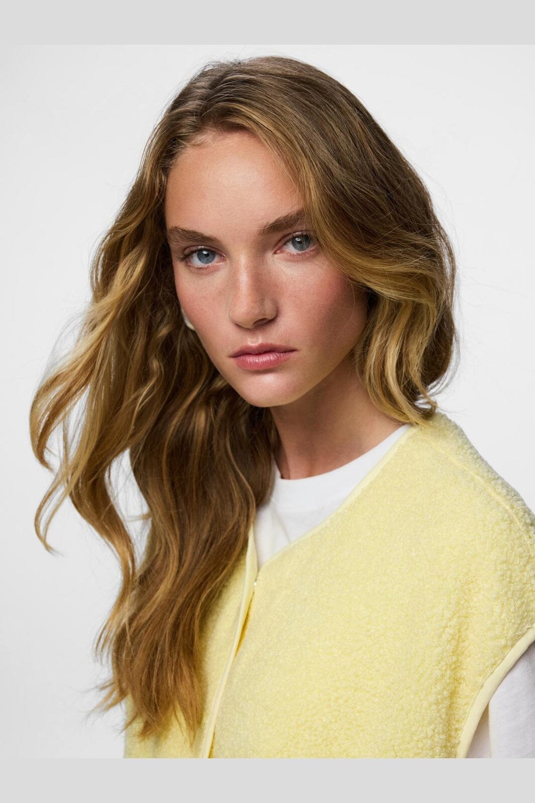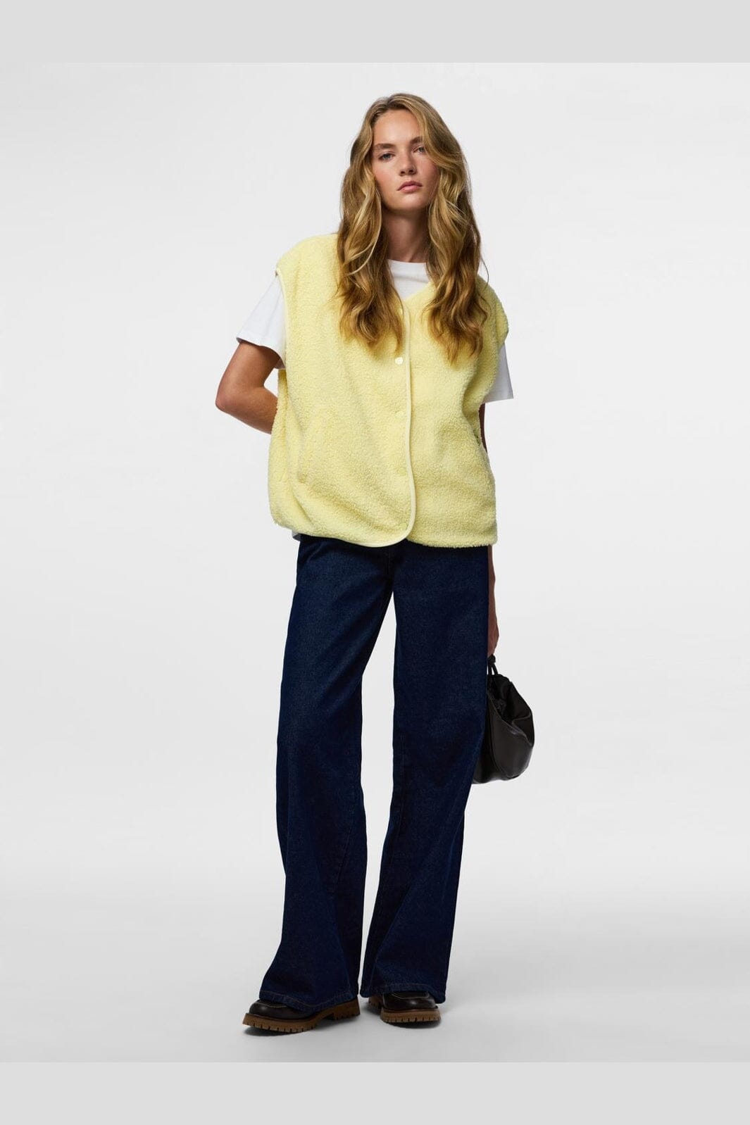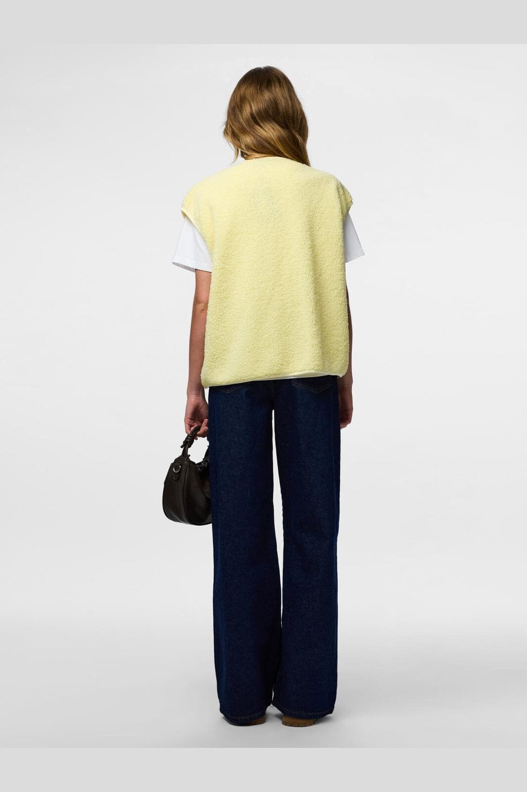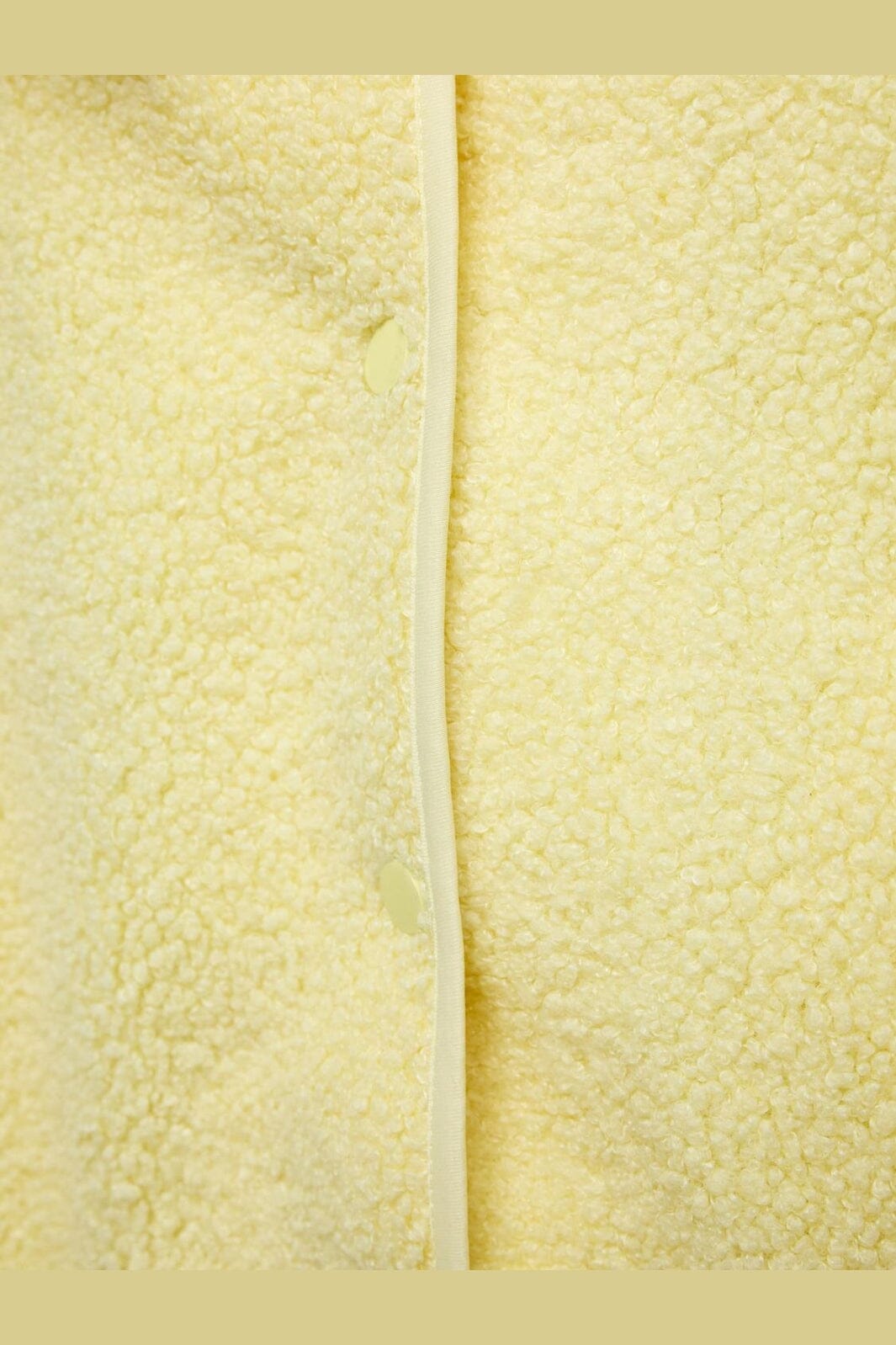 Ärmlös teddyväst från Pieces i färgen French Vanilla, en ljusgul nyans. Västen har en mjuk yta och tryckknappsstängning.