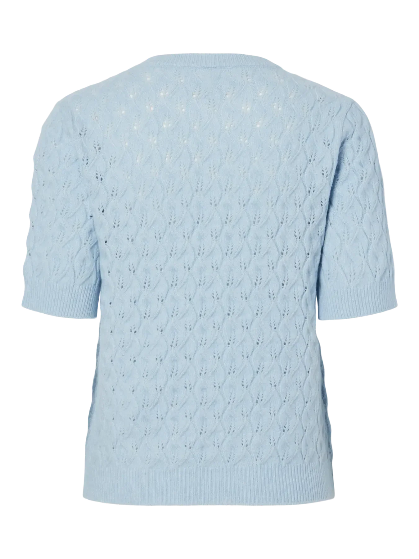 En stickad tröja från Pieces i en ljusblå melerad färg. Tröjan har korta ärmar, rund halsringning och dekorativa sömmar i ett bladmotiv.