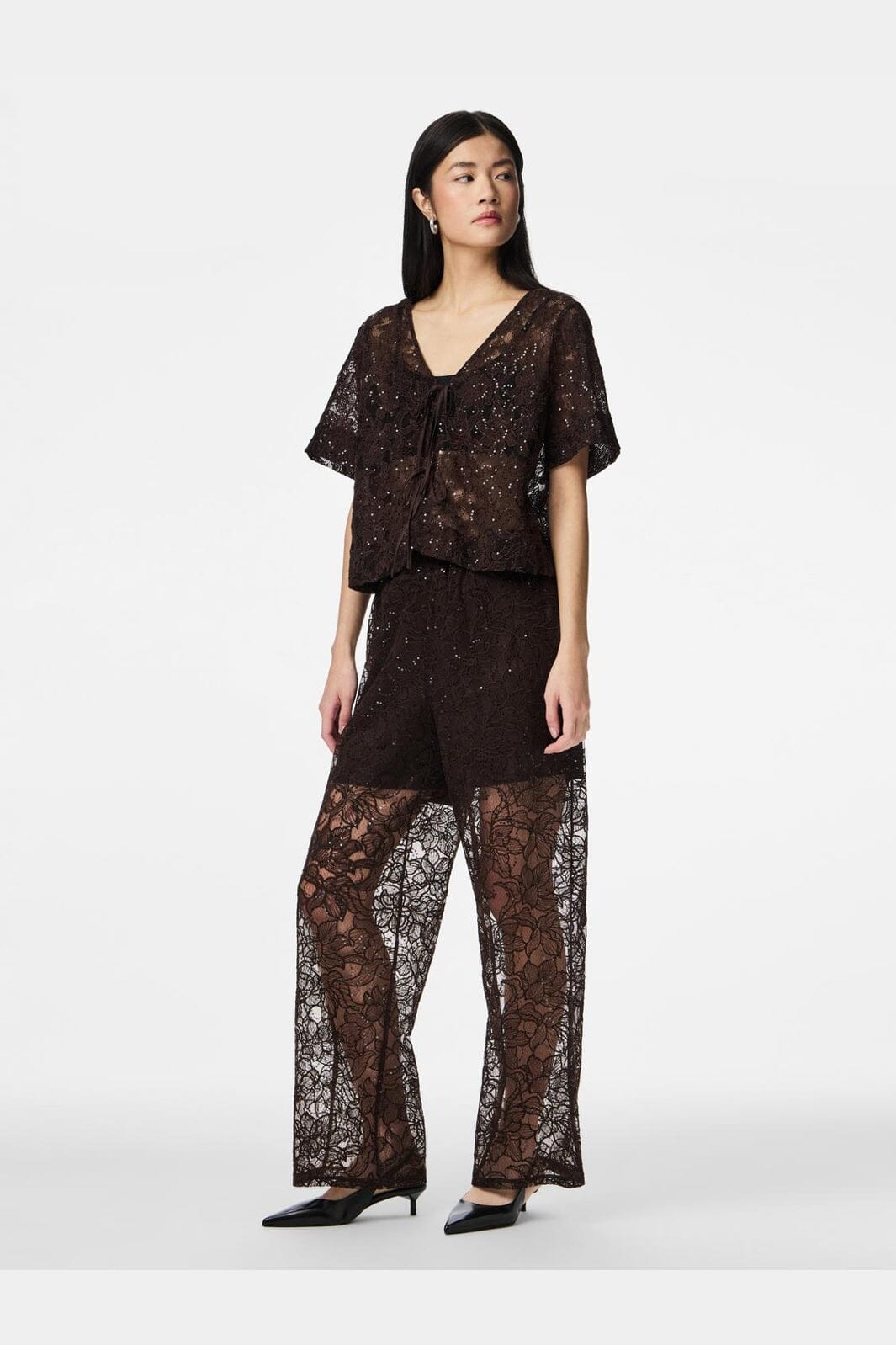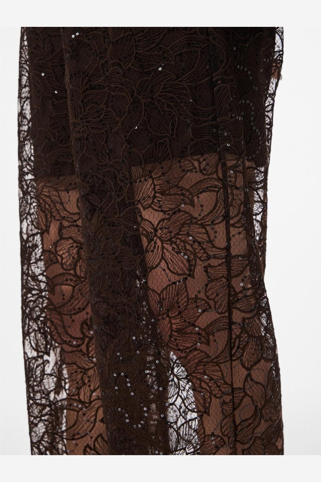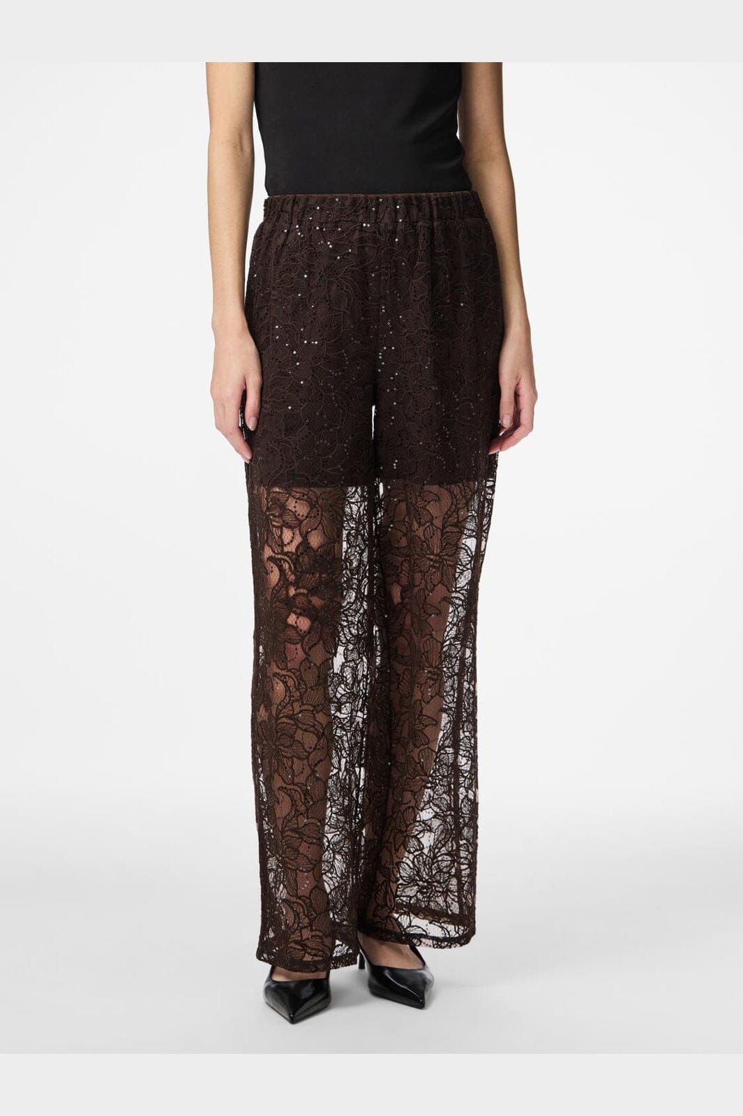 Raka byxor från Pieces, tillverkade av genomskinlig spets med blommönster och paljetter i en mörkbrun nyans.