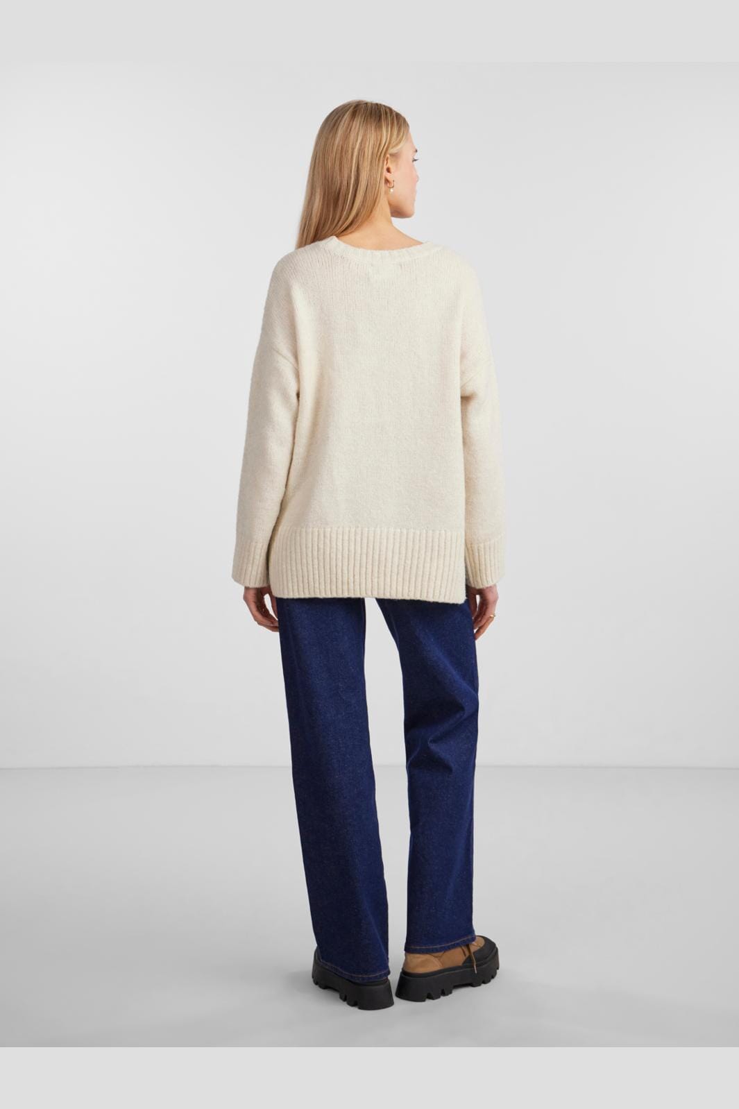 Oversized stickad tröja från Pieces i en ljus krämvit nyans. Den lösa passformen med långa ärmar och sänkta ax seams ger god rörelsefrihet.