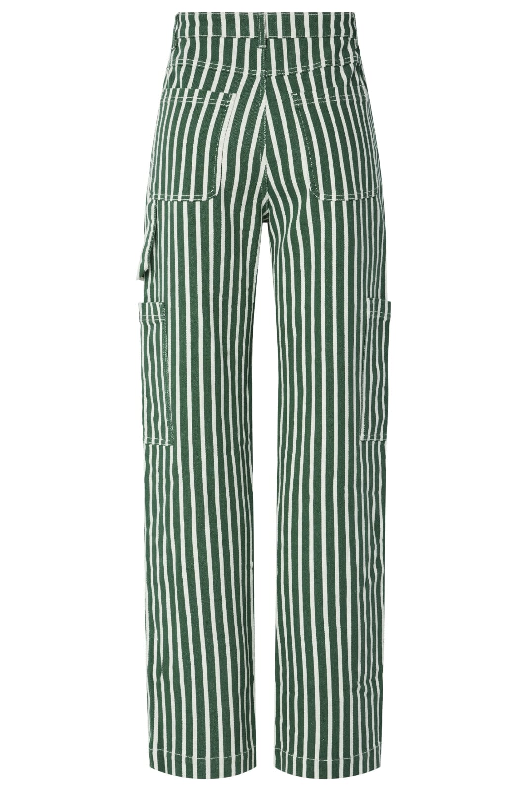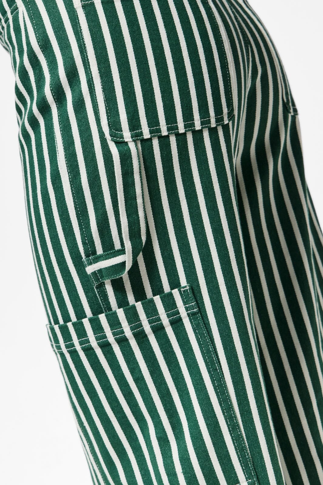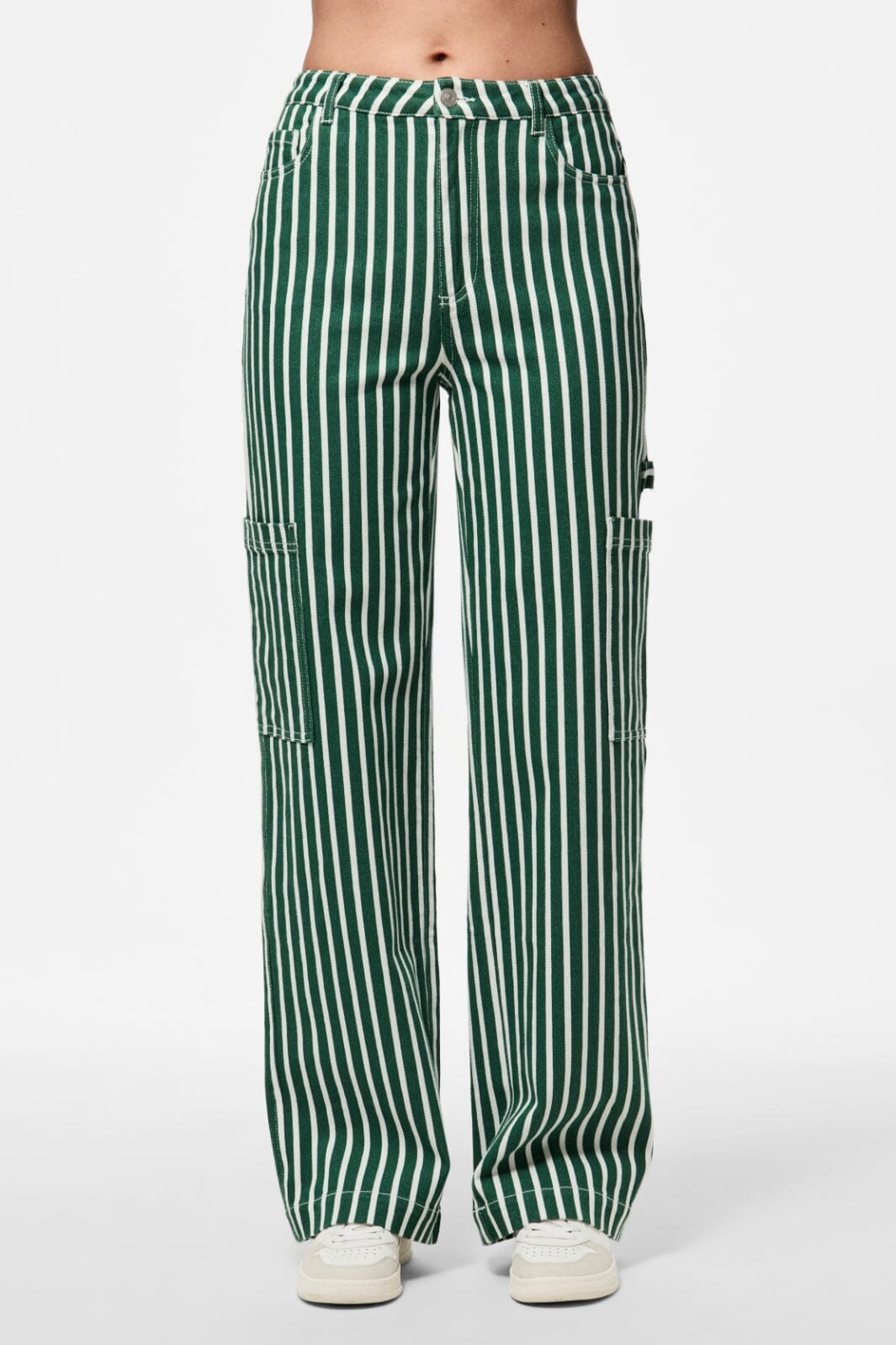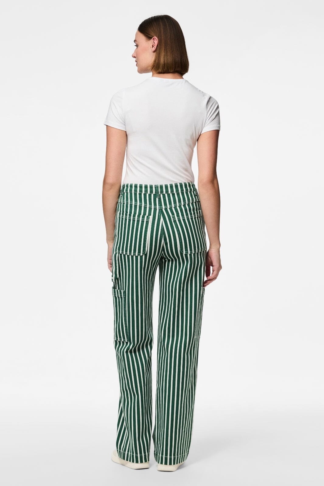 Randiga denimjeans från Pieces med vertikala ränder i jaktgrön och vit. Byxorna har cargo-fickor på sidorna och en loose fit-passform med raka ben.