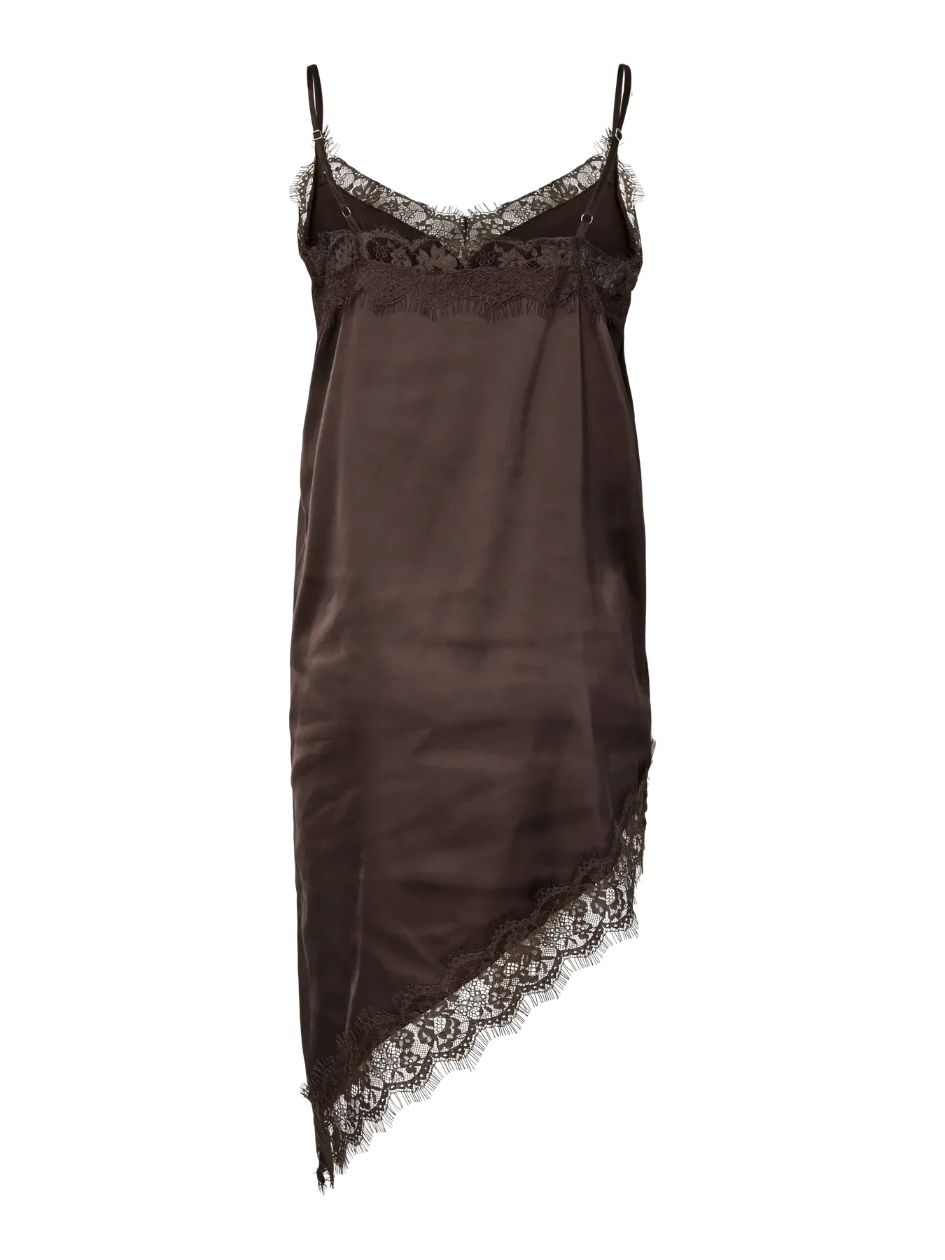 Brun satinklänning från Pieces med spetsdetaljer och spagettistropper. Klänningen har en V-ringning och en asymmetrisk kant nertill.
