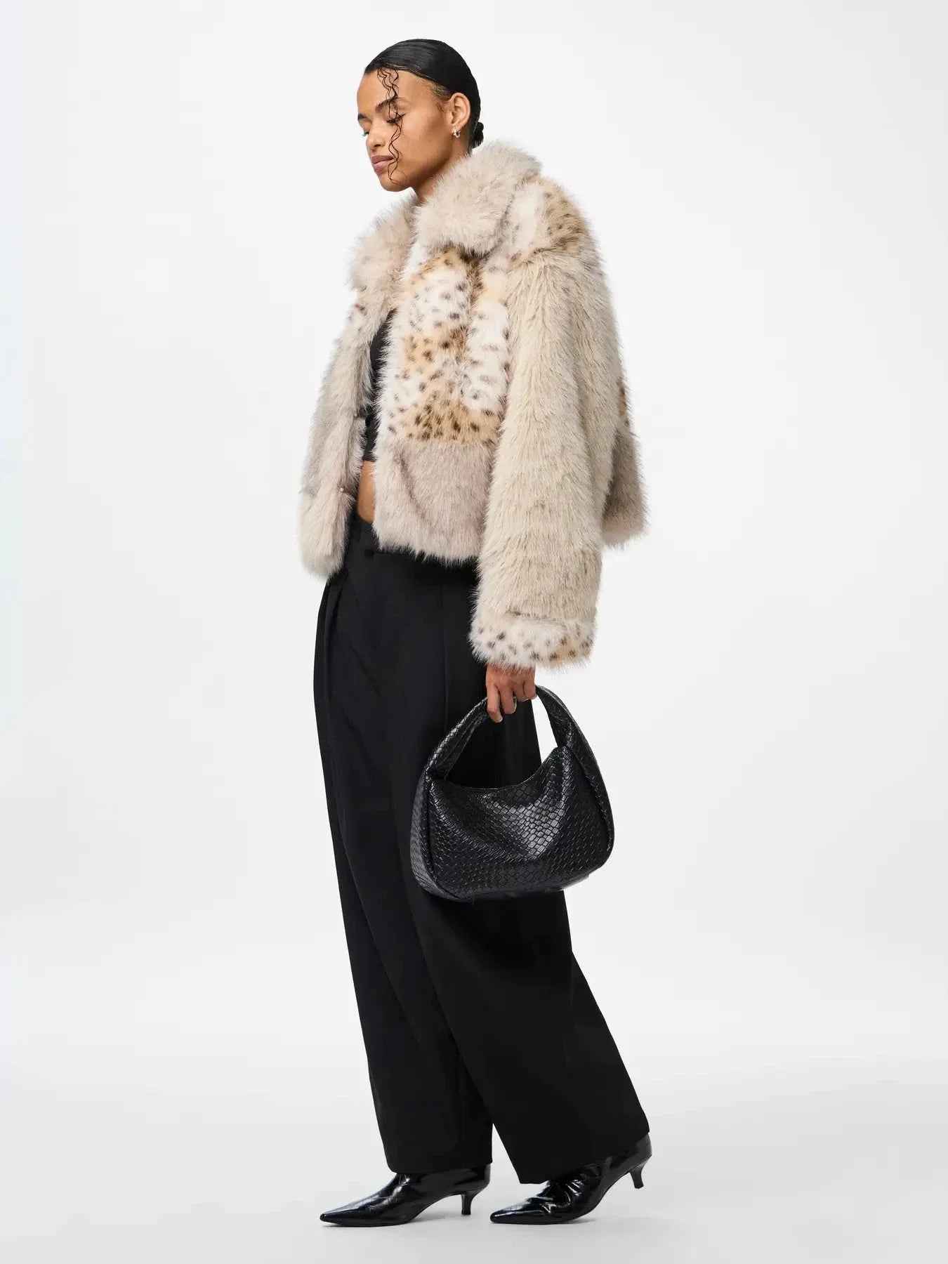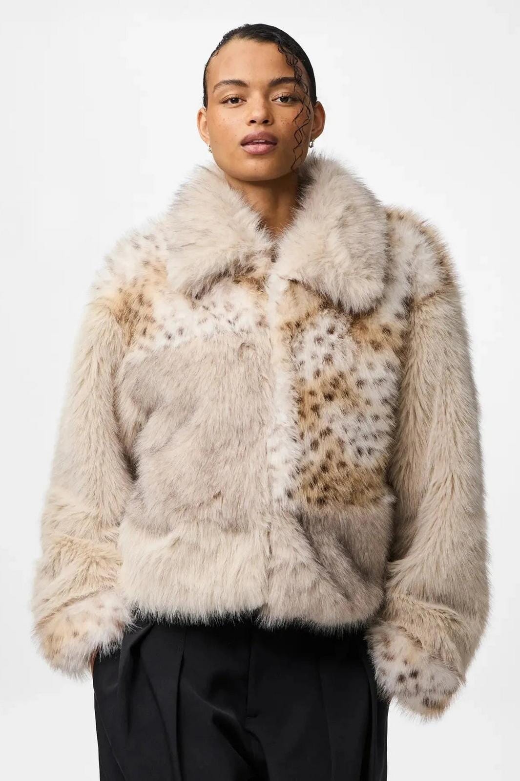 Kort fluffig jacka från Pieces, tillverkad av 100% polyester i en grå patchwork-design. Jackan har skjortkrage, långa ärmar och en lös passform.