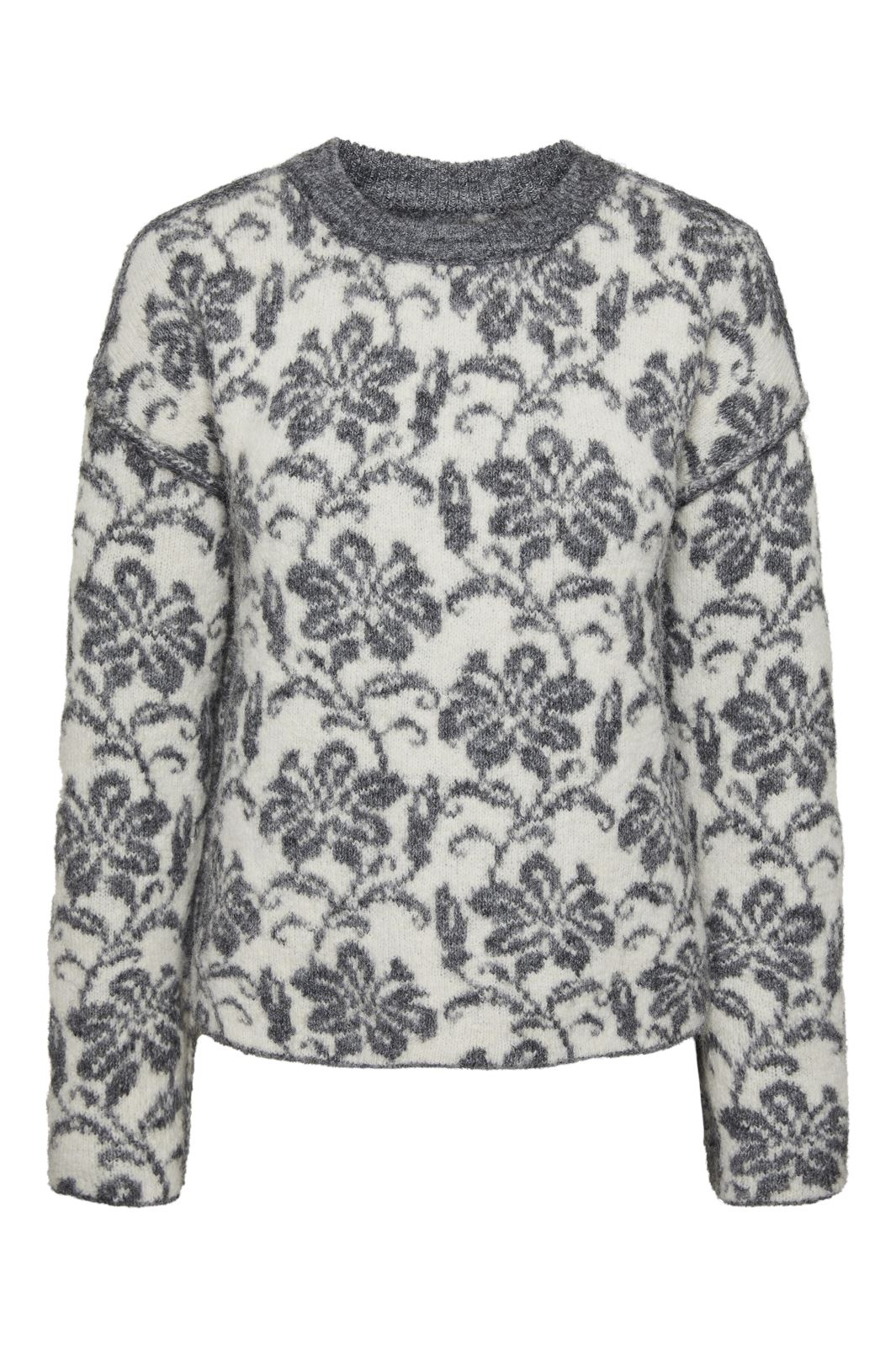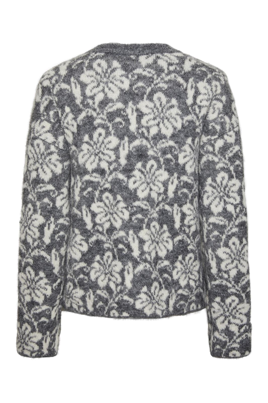 Stickad tröja från Pieces med blommig jacquardmönster i grå och vita nyanser. Den har rund halsringning och långa ärmar med en regular fit.