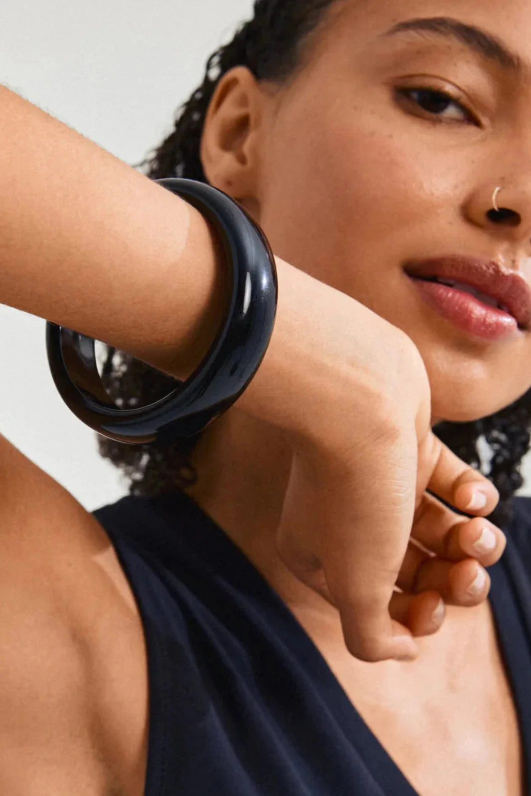 Svart armband från Pilgrim med en rund form och slät yta. Den invändiga guldplattan ger armbandet en diskret detalj som passar bra tillsammans med andra smycken.