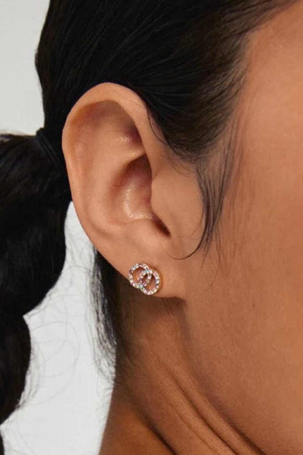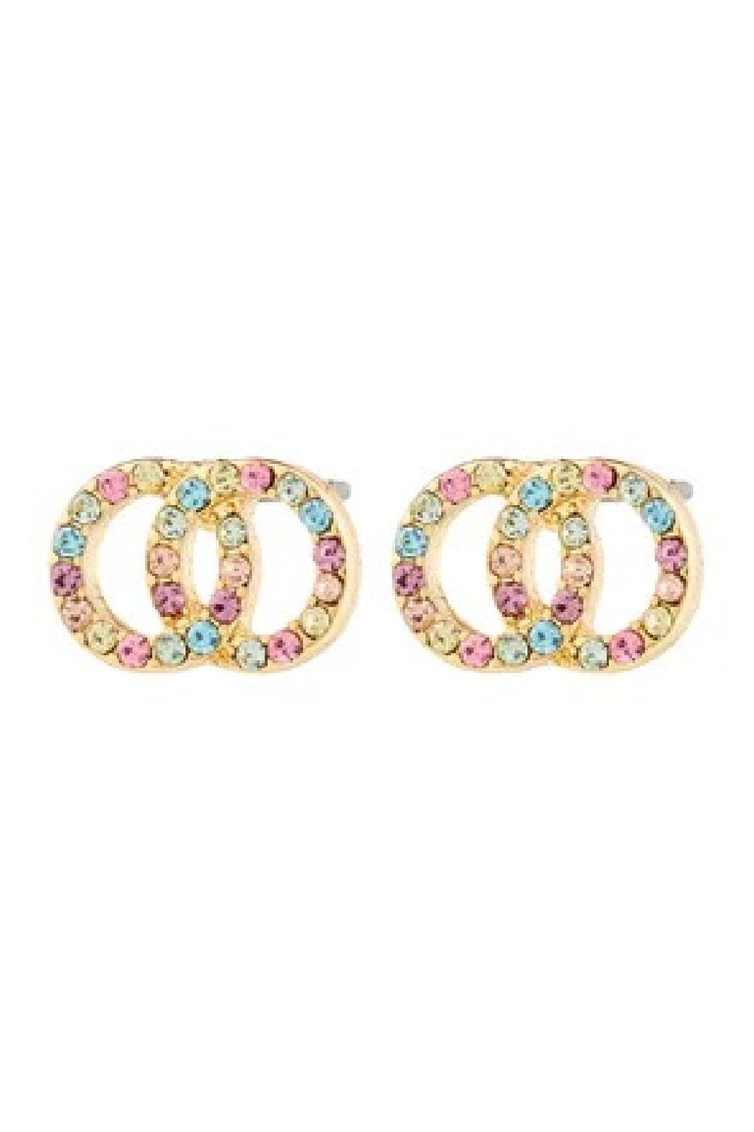 Guldpläterade örhängen från Pilgrim med sammanlänkade cirklar. Örhängena har små färgade stenar i rosa, blått och grönt som bildar ett mönster i det gyllene metallen.