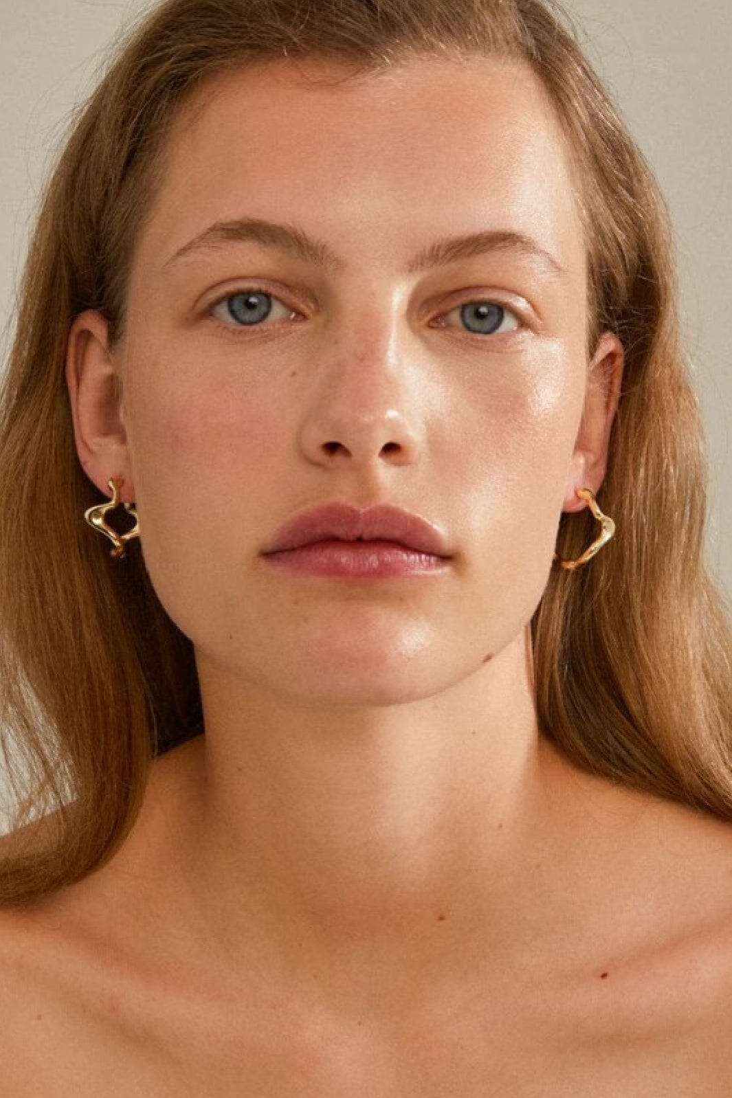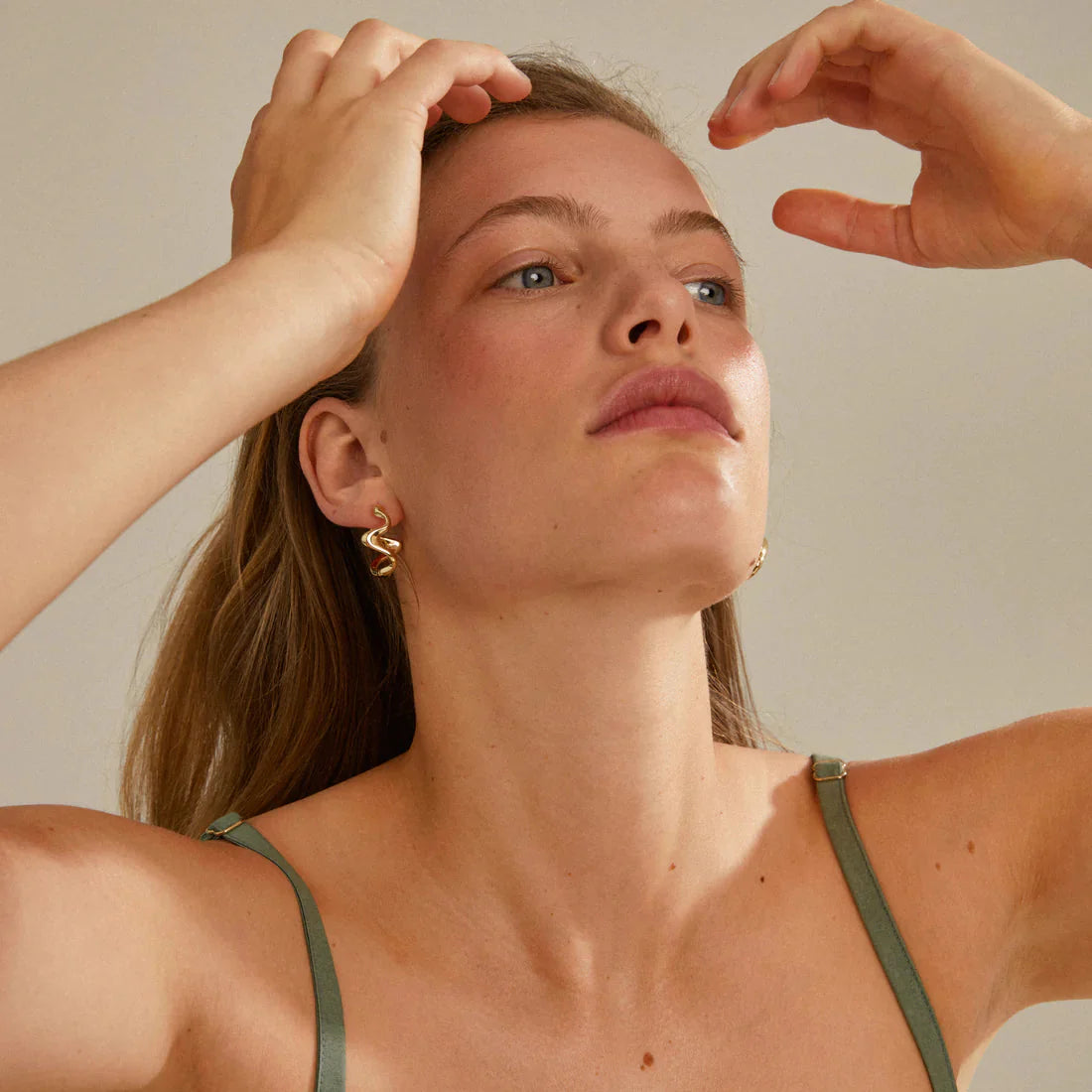 Guldörhängen från Pilgrim med en vågig, skulptural design. Örhängena är tillverkade av återvunnen mässing med en blank guldbeläggning som framhäver det organiska formspråket.