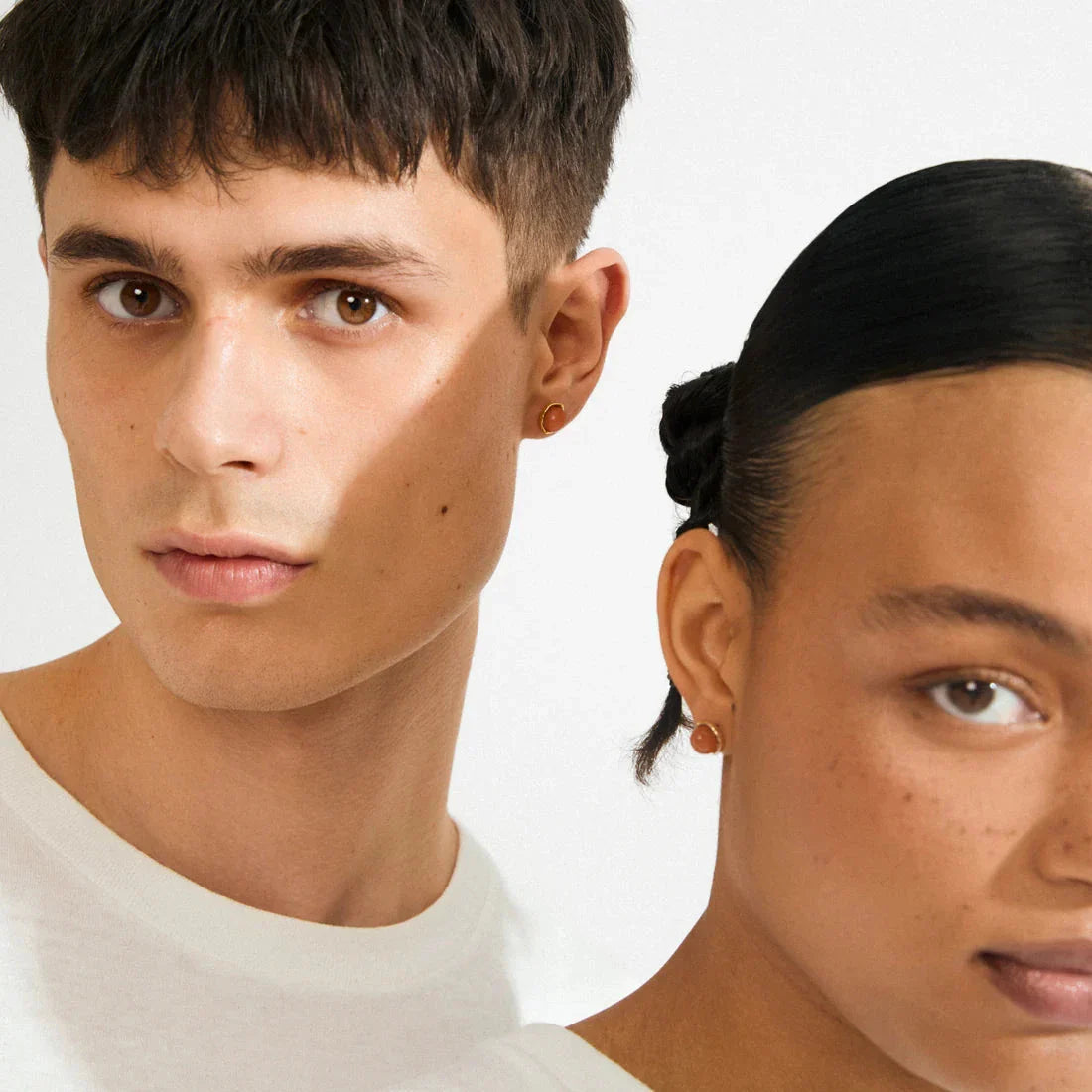 Guldpläterade örhängen från Pilgrim med orange aventurinstenar. Stenarna har en rund form och sitter i en guldfärgad infattning med öronstift.