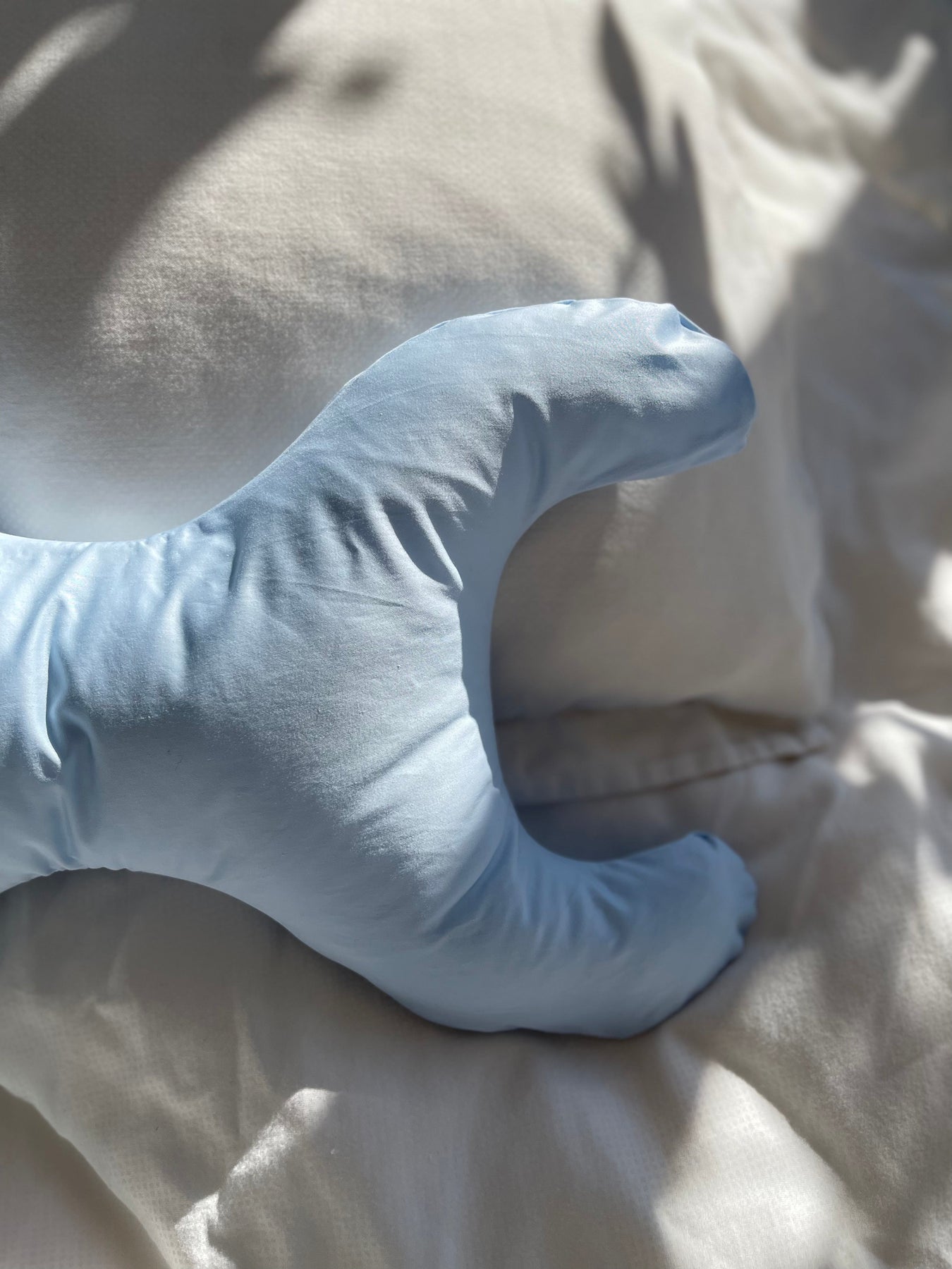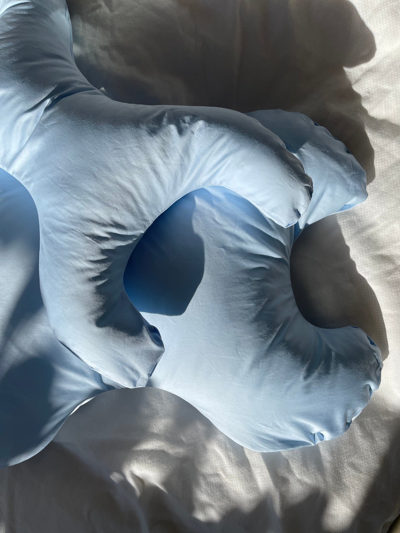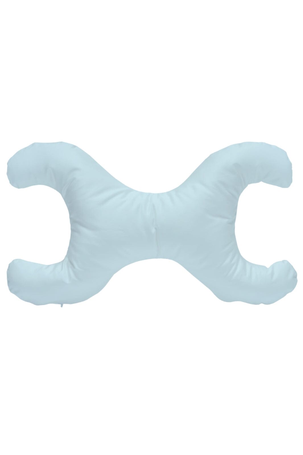 Liten kudde med X-formad design och ljusblått överdrag i 100 % bomull. Kudde är fylld med syntetiska fibrer som är både bakterieresistenta och fuktavvisande.