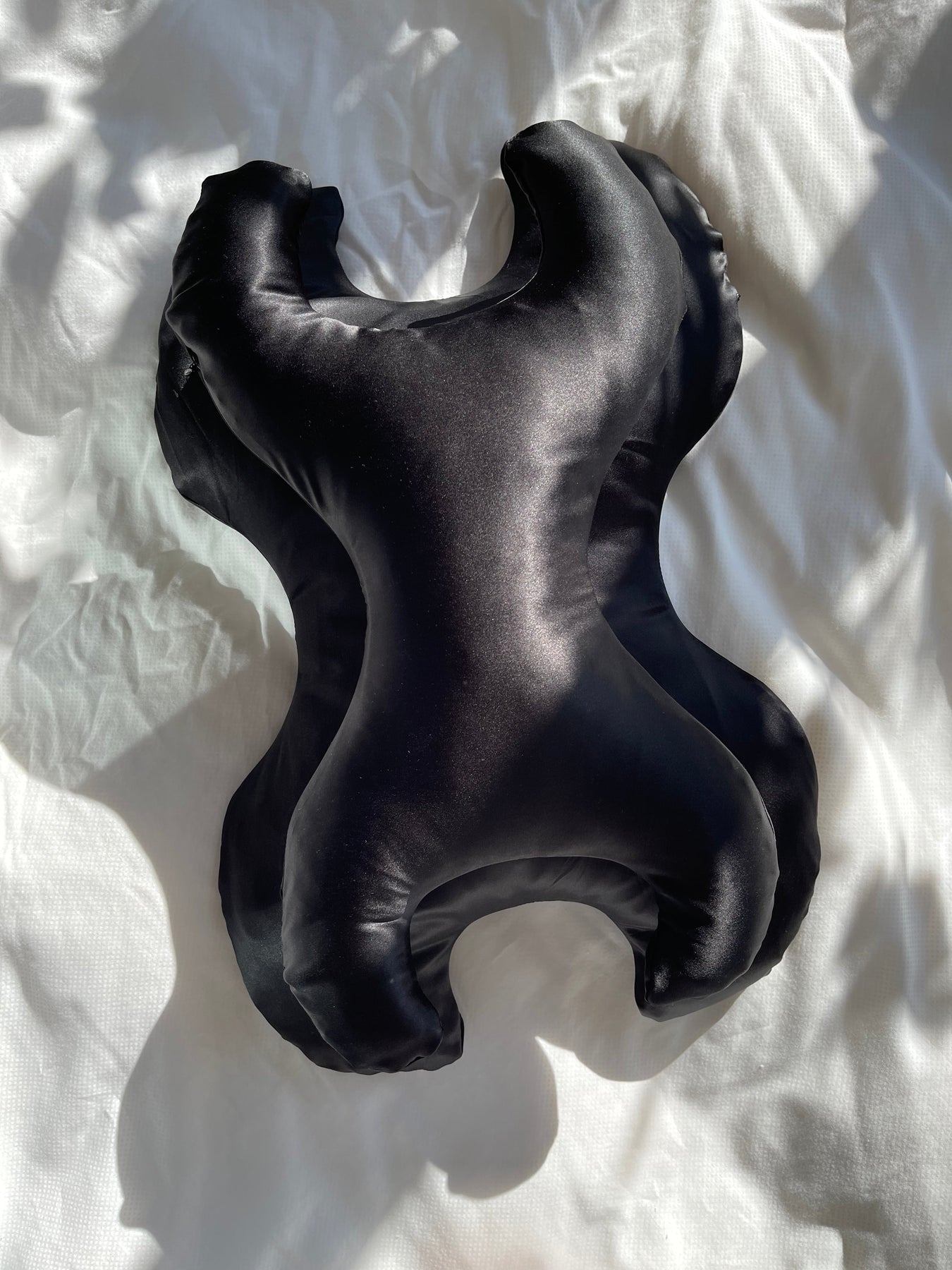 Svart kudde från Save My Face med silkebeträck. Kudden har en speciell form och är fylld med syntetiska fibrer som är motståndskraftiga mot bakterier.