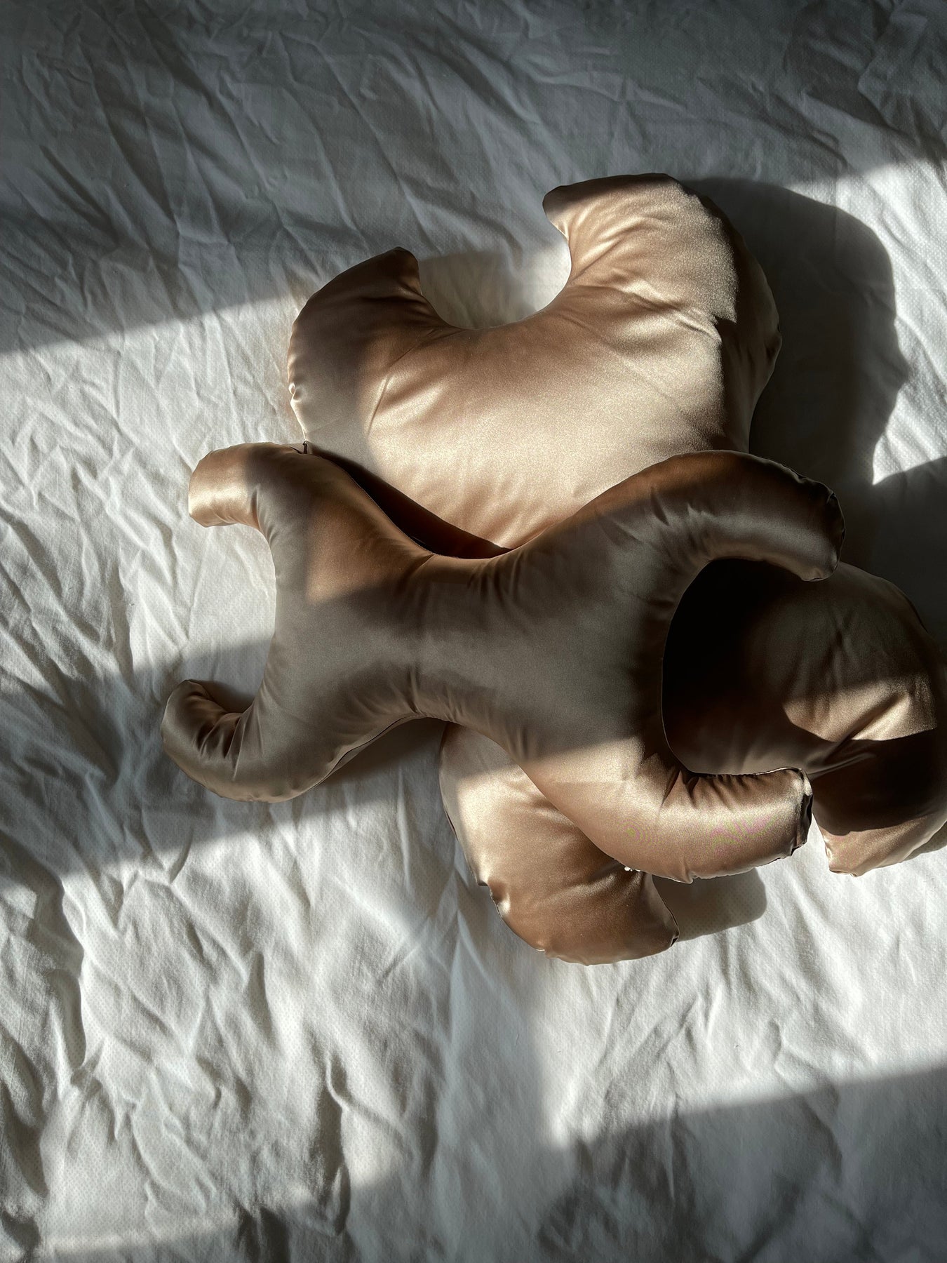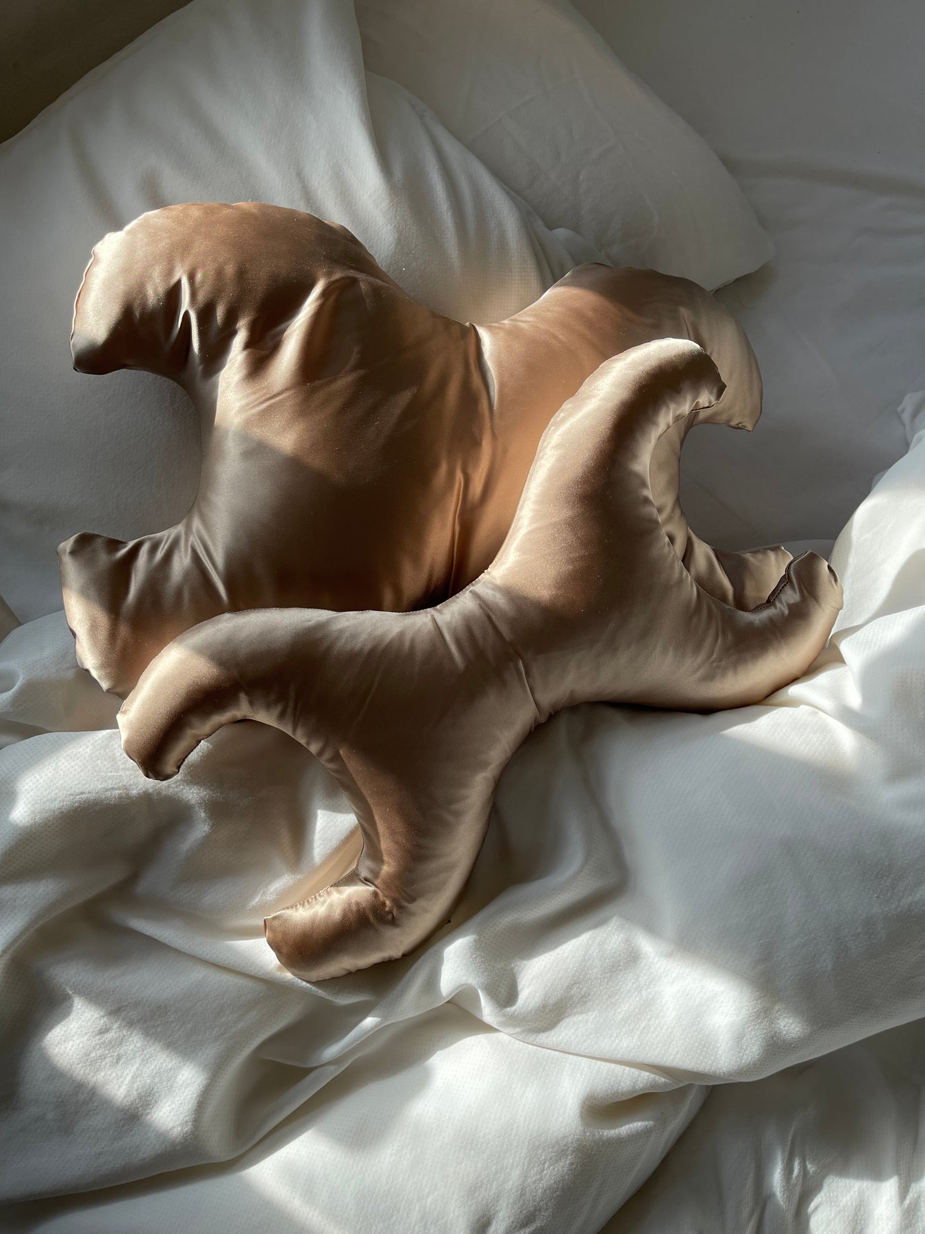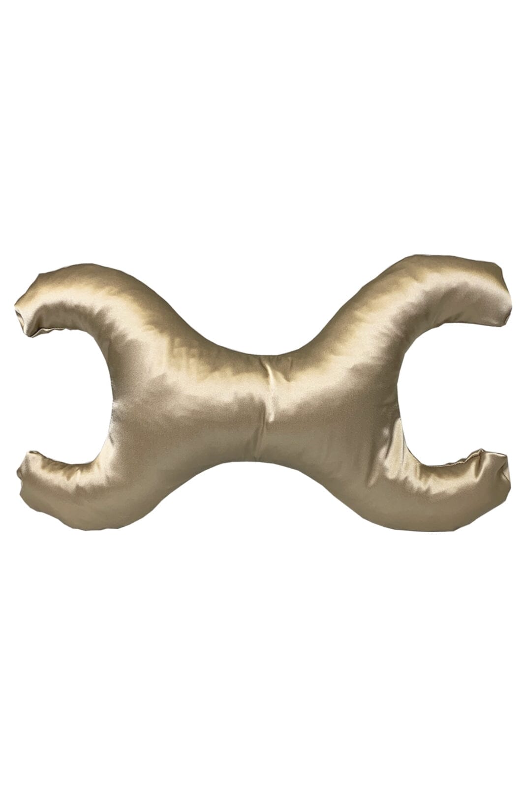 Liten kudde med bronzfärgad silkebeklädnad från Save My Face. Kudden har en X-formad design och kombinerar allergivänliga fibrer med temperaturreglerande silke.