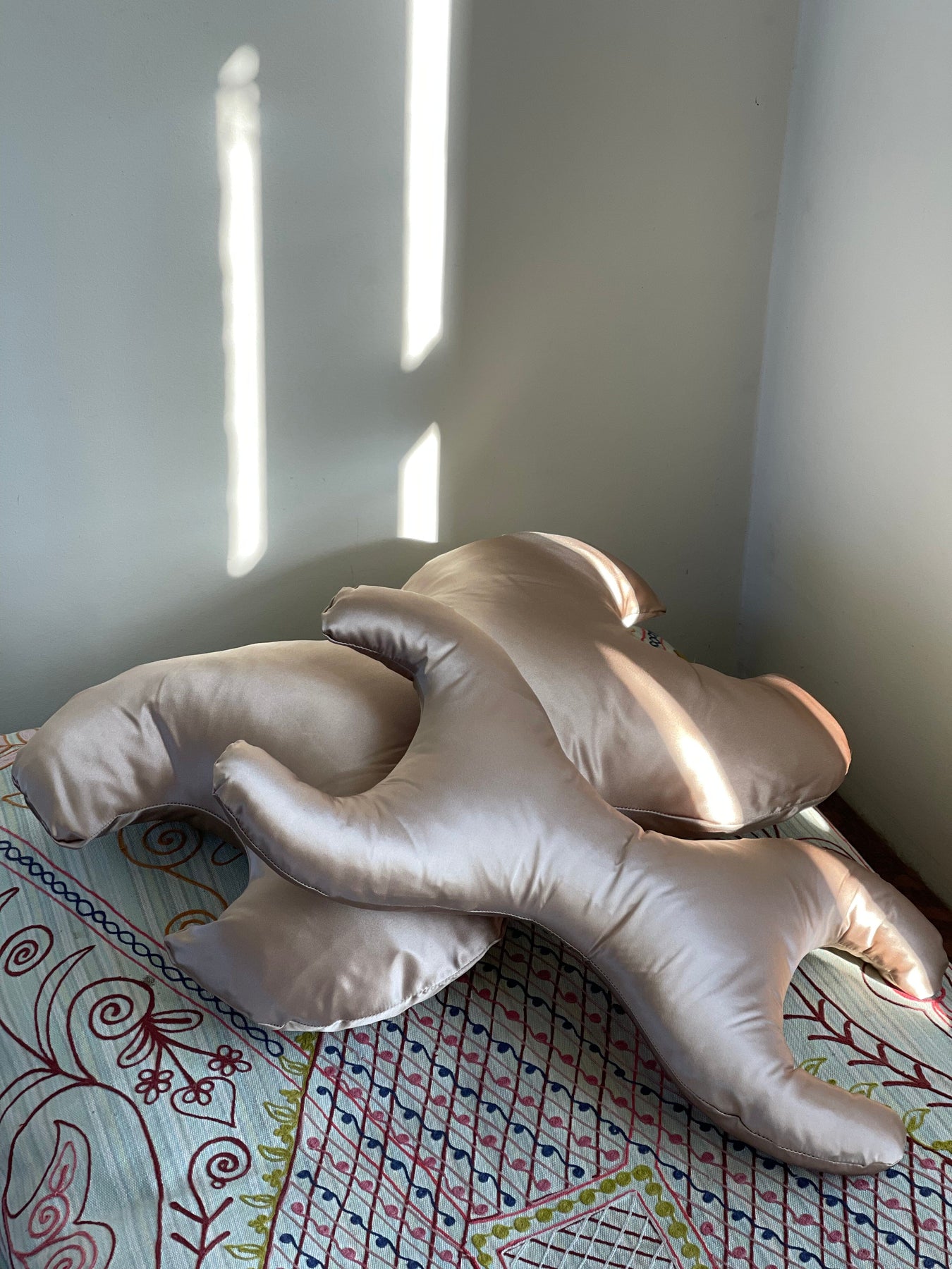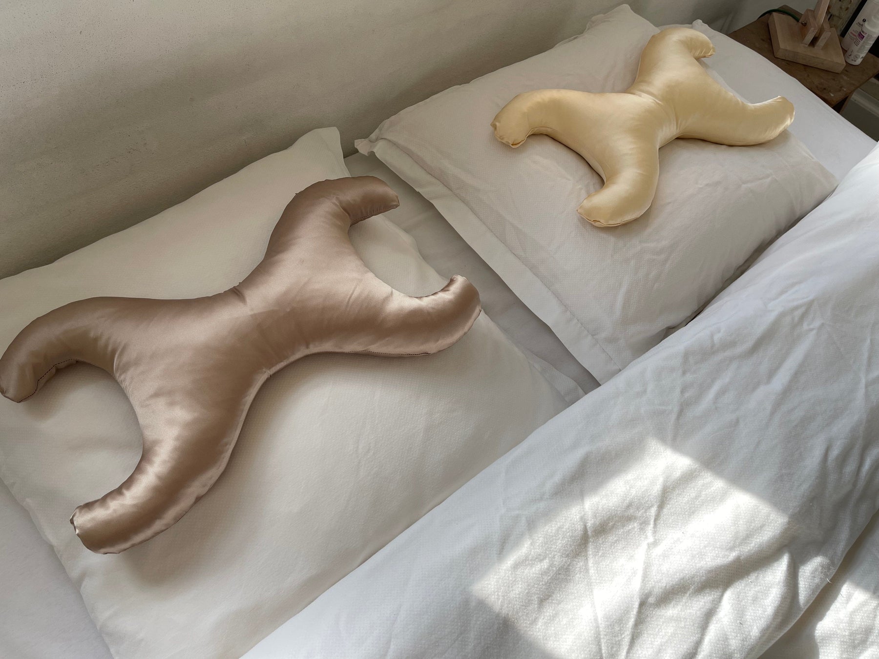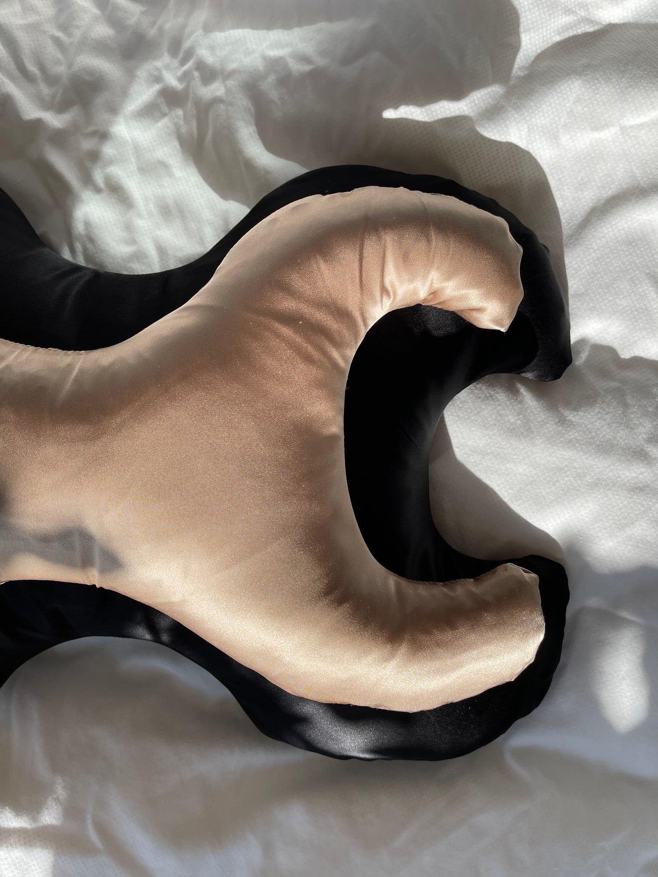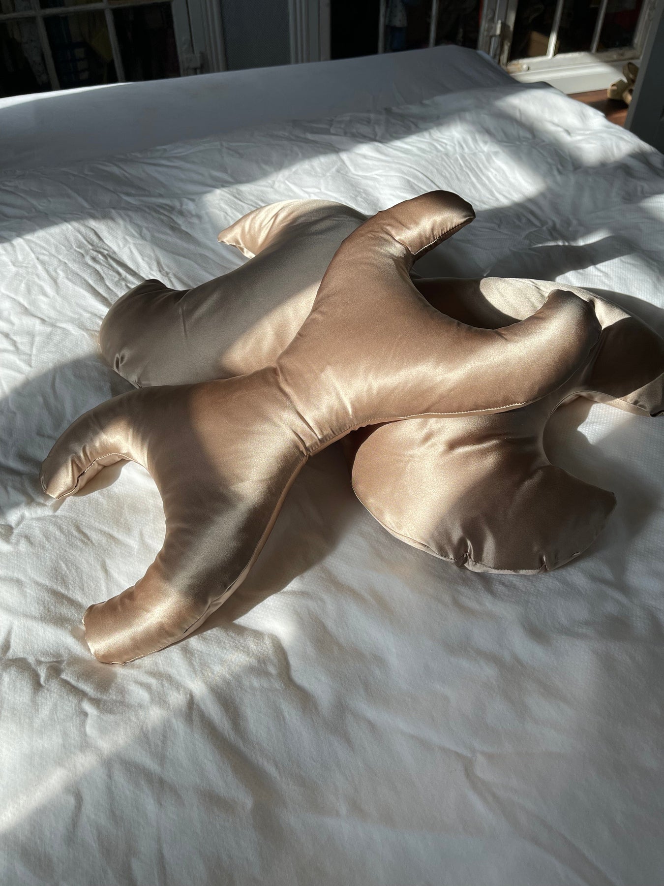 Liten kudde med bronzfärgad silkebeklädnad från Save My Face. Kudden har en X-formad design och kombinerar allergivänliga fibrer med temperaturreglerande silke.