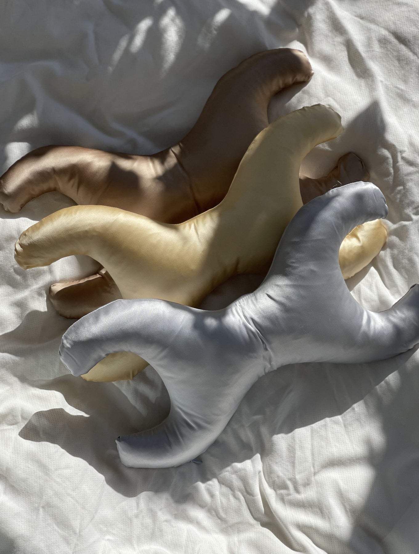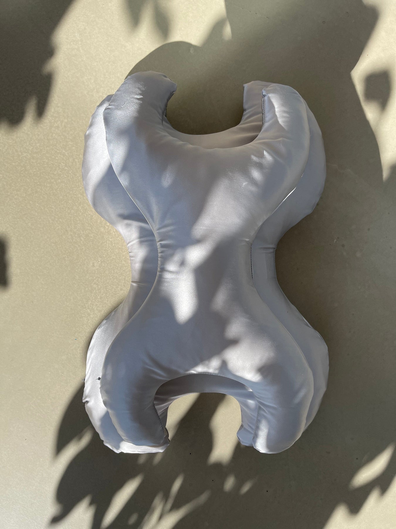 Liten kudde med timmerform från Save My Face. Den silverfärgade kudden har ett avtagbart överdrag i silke och är designad för att minska sömnrynkor.
