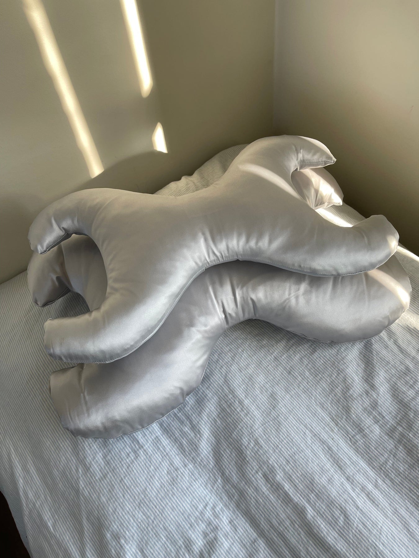 Liten kudde med timmerform från Save My Face. Den silverfärgade kudden har ett avtagbart överdrag i silke och är designad för att minska sömnrynkor.