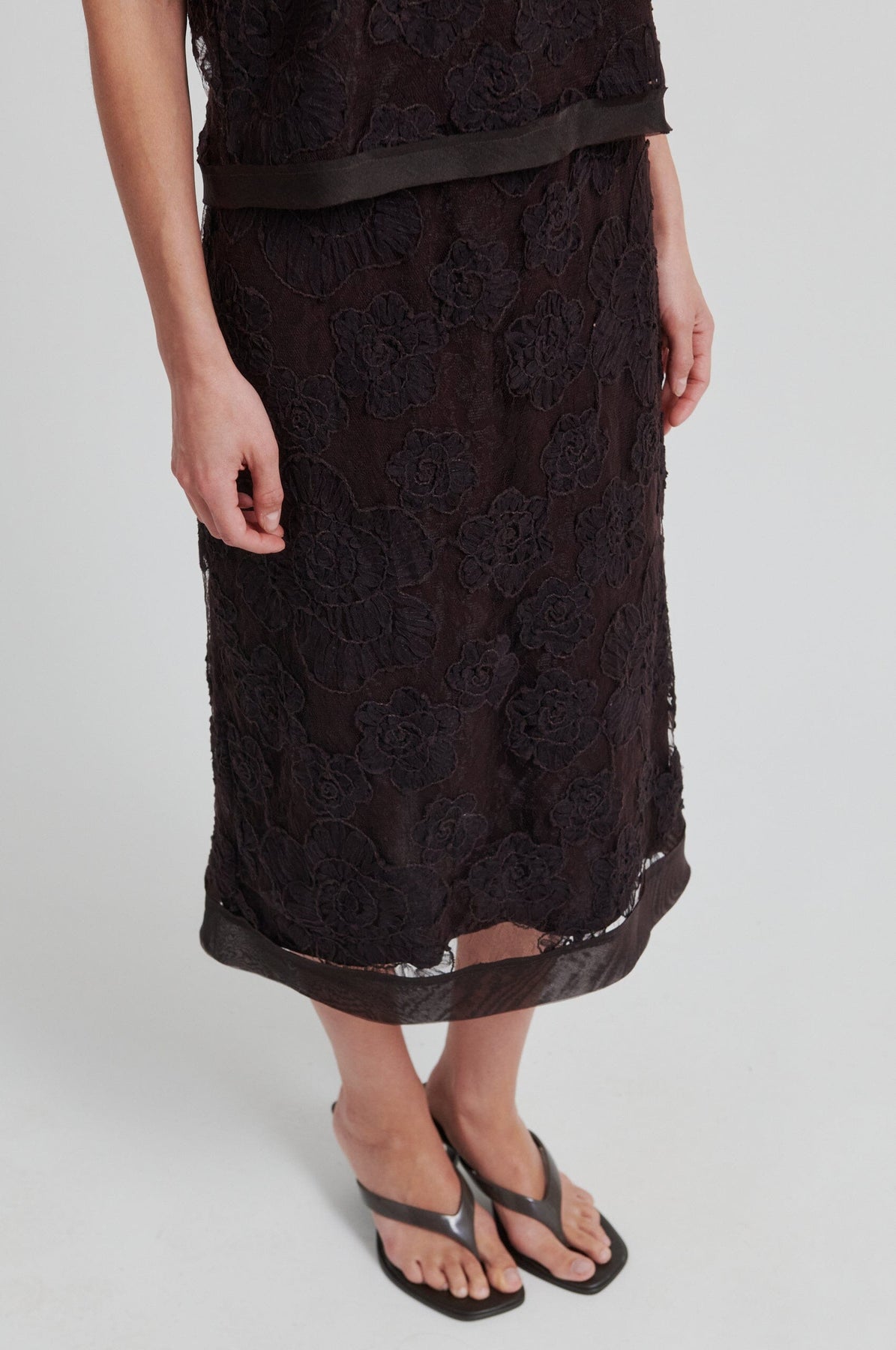 Mörkbrun kjol från Second Female med spetslager och broderade blommor. Ett enfärgat lager sitter under spetsen, och kjolen har råa kantdetaljer.