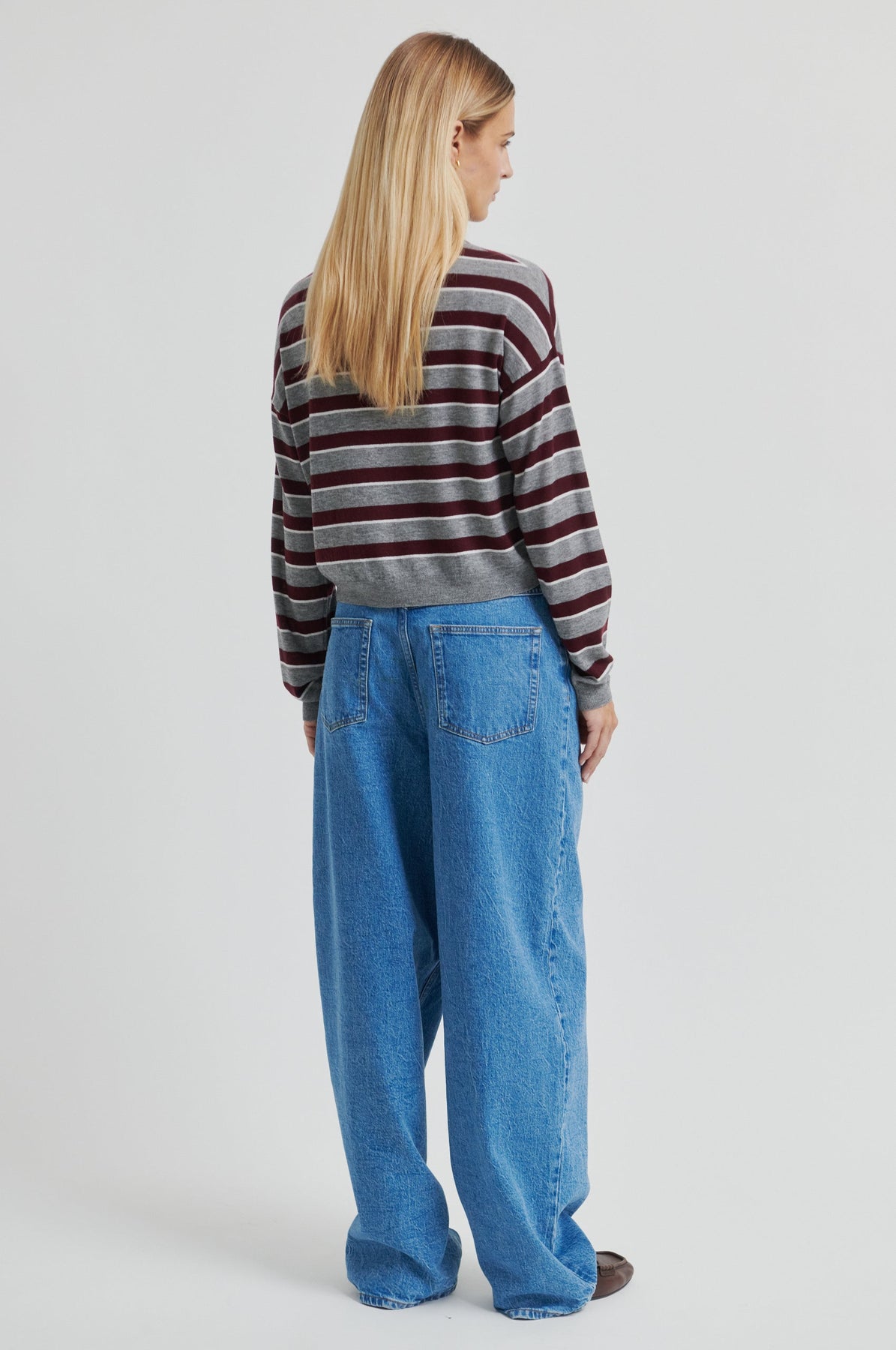Pullovern är tillverkad i en mjuk merinoullblandning med genomgående ränder.