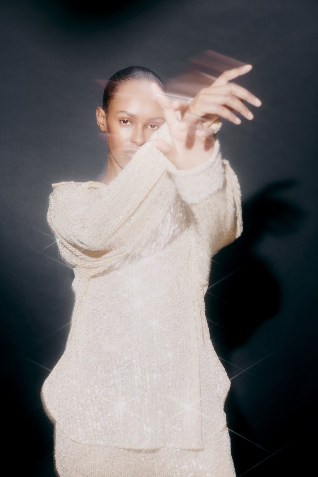 Second Female pailletbluse med bittesmå, runde pailletter på halvgennemsigtigt mesh. Kjolen har åben hals med krave og skjortemanchetter. Dropskuldre og formsyet søm. Helforet. Afslappet, lige pasform.