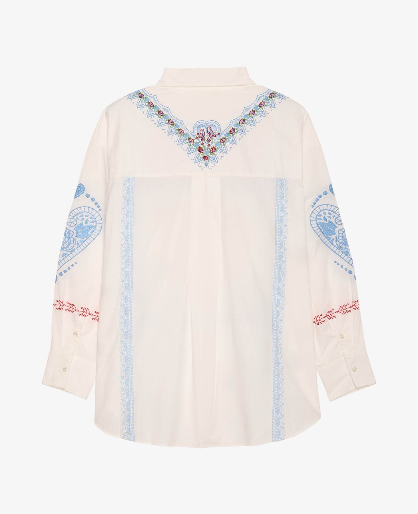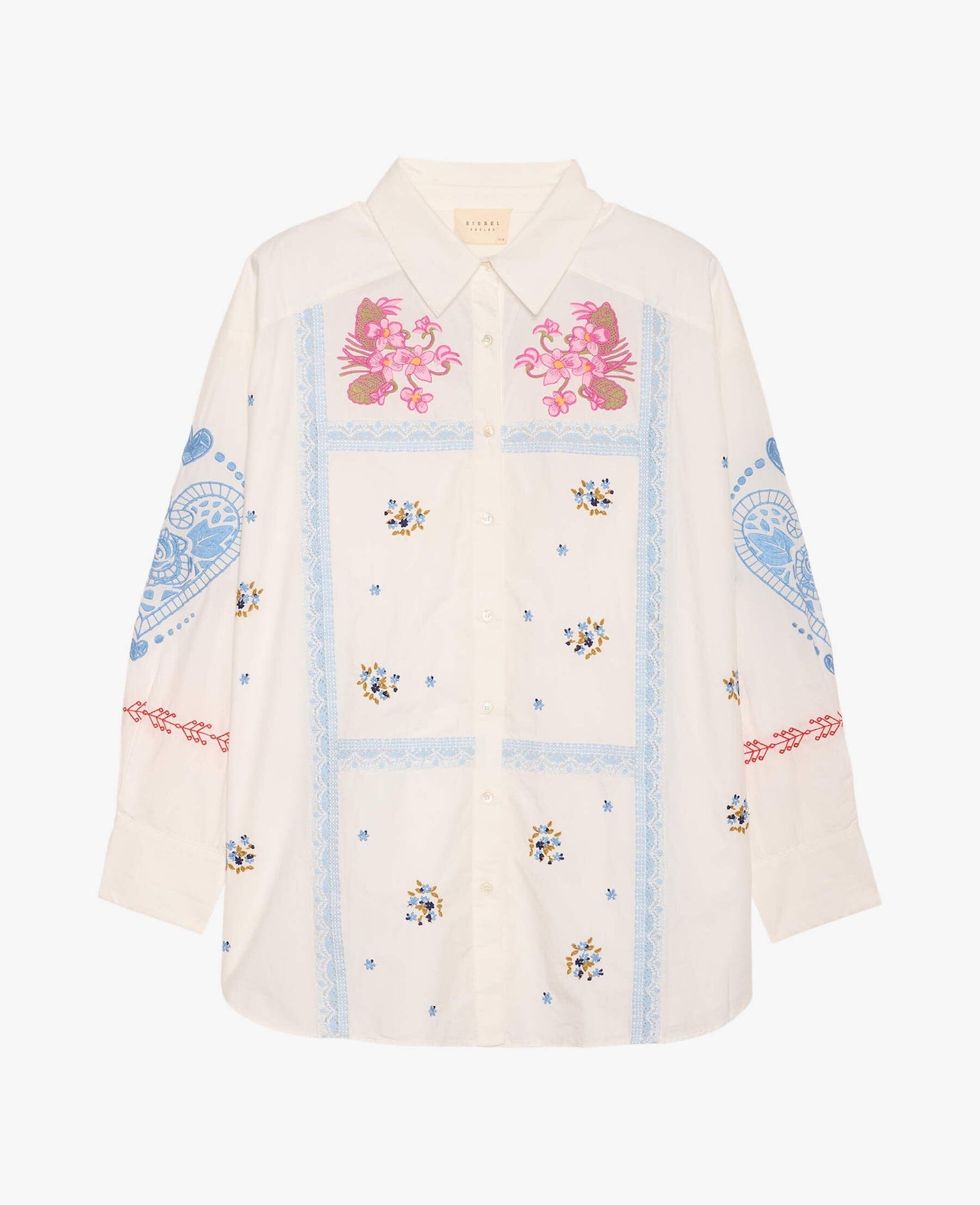 Vit skjorta från Sissel Edelbo med broderade blommor och hjärtan i rosa och blå nyanser samt fina spetsdetaljer längs ärmarna.