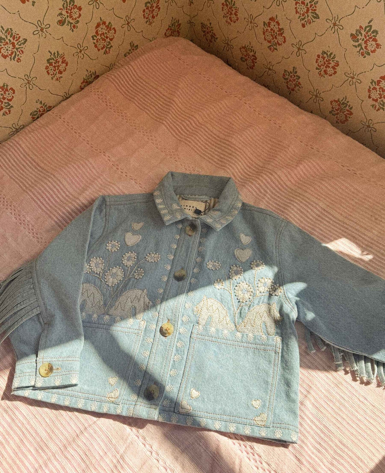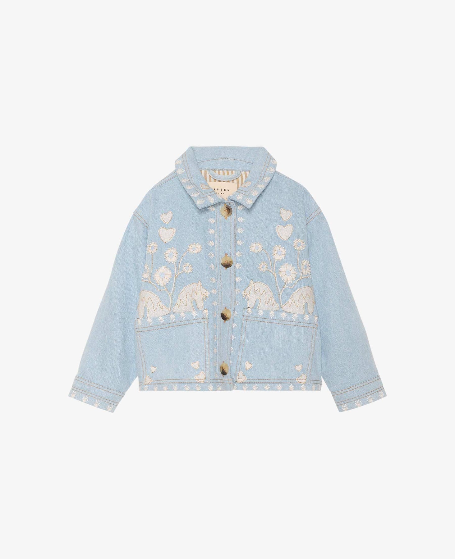 Ljusblå denimjacka från Sissel Edelbo med broderade blommor och hjärtan. Jackan har en oversized passform med skjortkrage och knappar hela vägen ner.