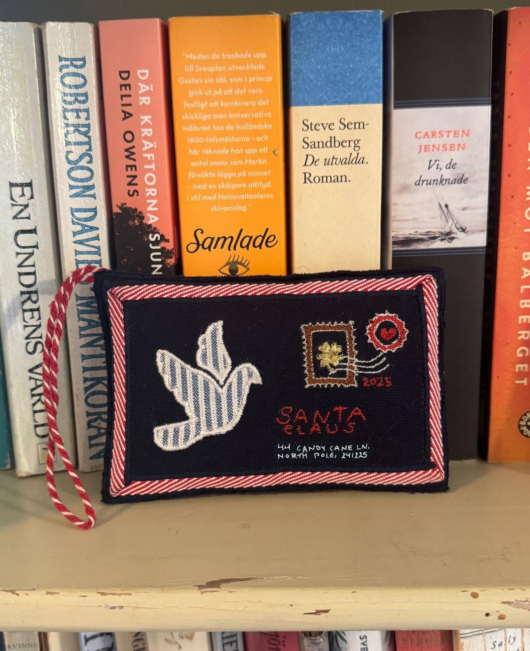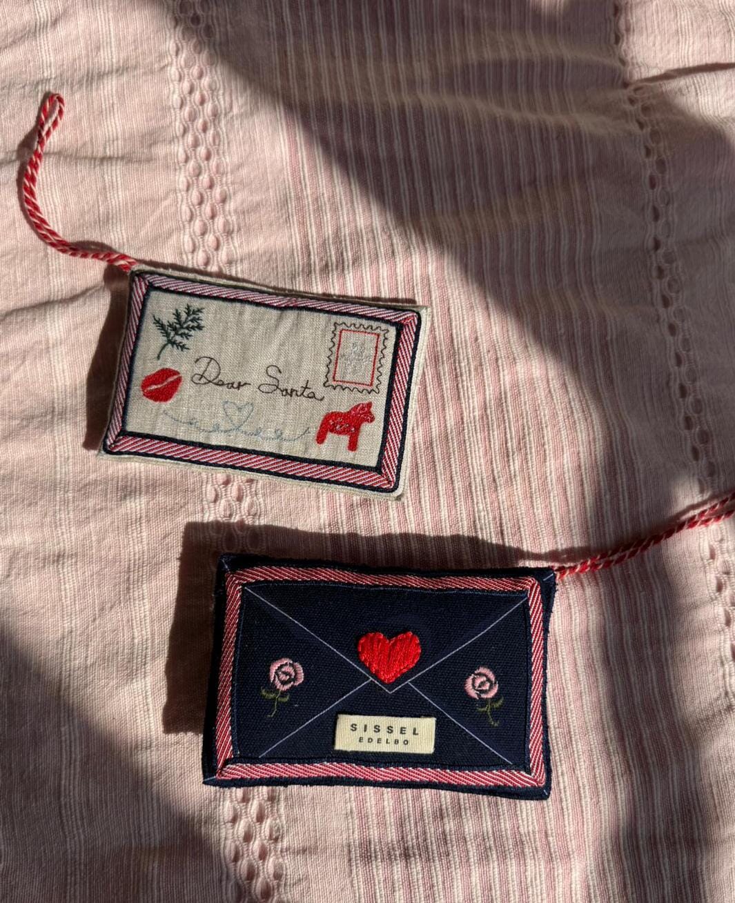 Julpynt från Sissel Edelbo format som ett kuvert i mörkblå bomull. Ornamentet har en fredsduveapplikation och broderade detaljer med hjärtan, rosor och frimärken.
