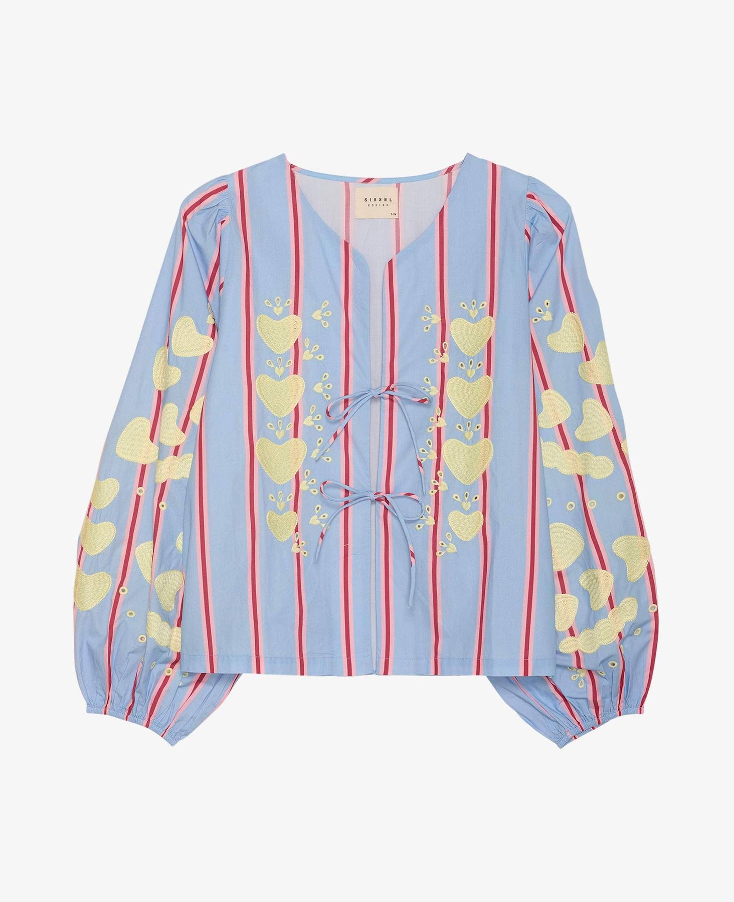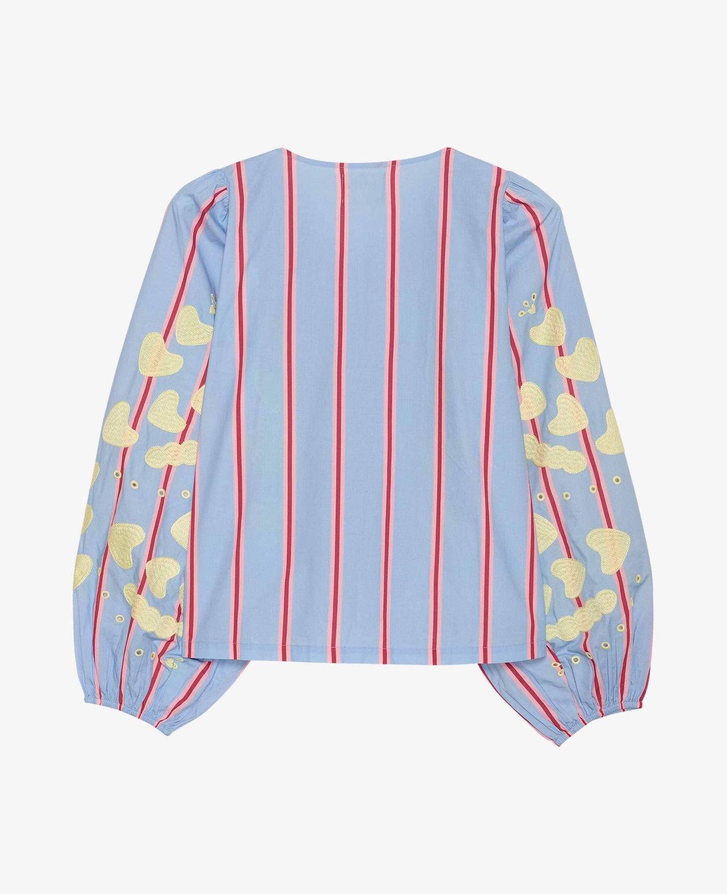 Ljusblå topp från Sissel Edelbo med röda ränder och gröna hjärtbroderier. Toppen är gjord av 100 % ekologisk bomullspoplin med en öppen front.