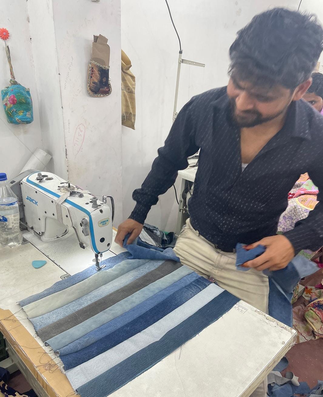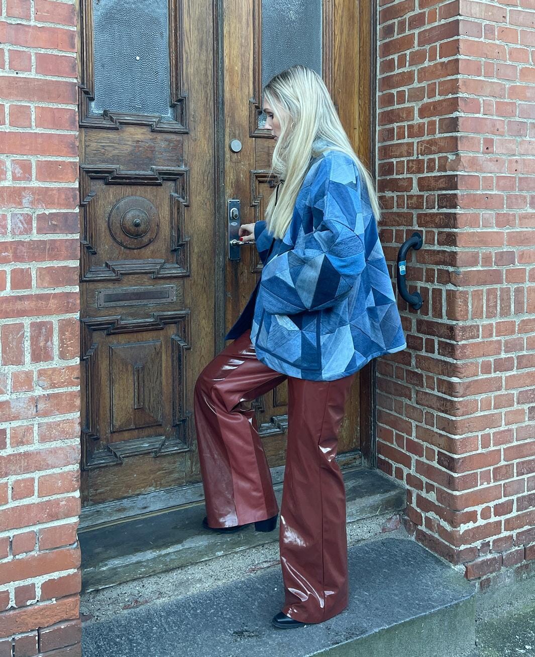 Denimjacka från Sissel Edelbo med patchwork-design i olika blå nyanser. Jackan är gjord av återvunna denimjeans med marinblå bomullsfoder.