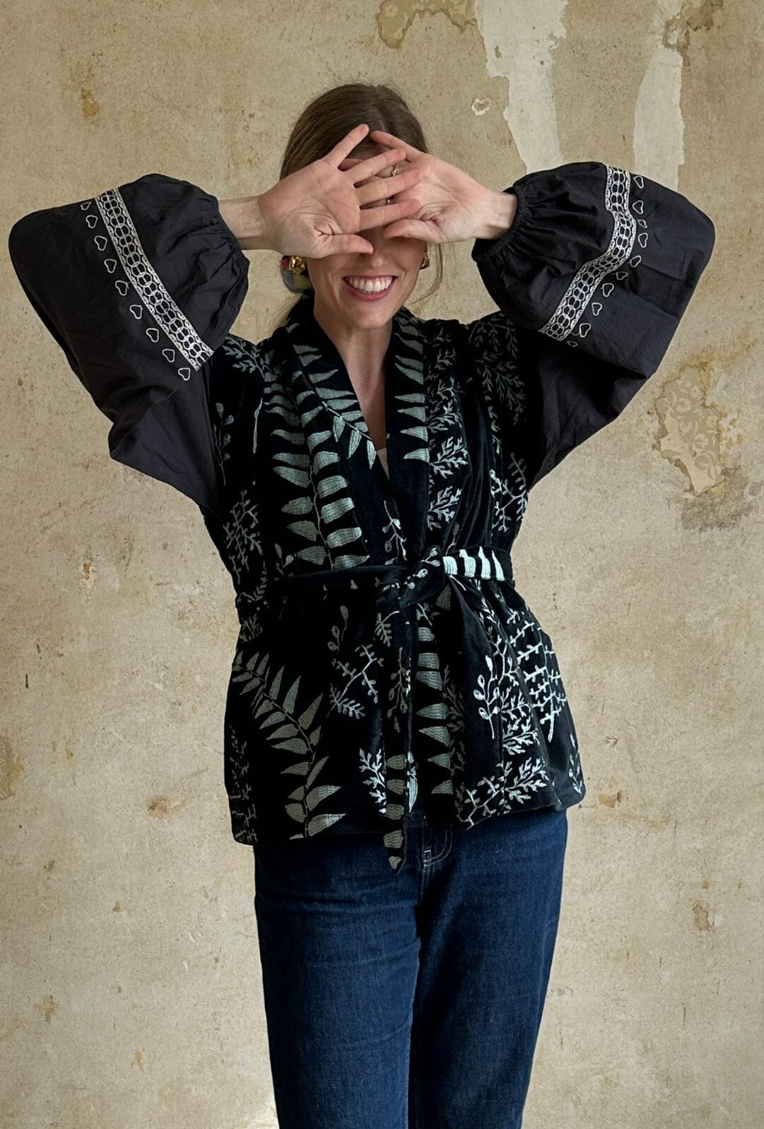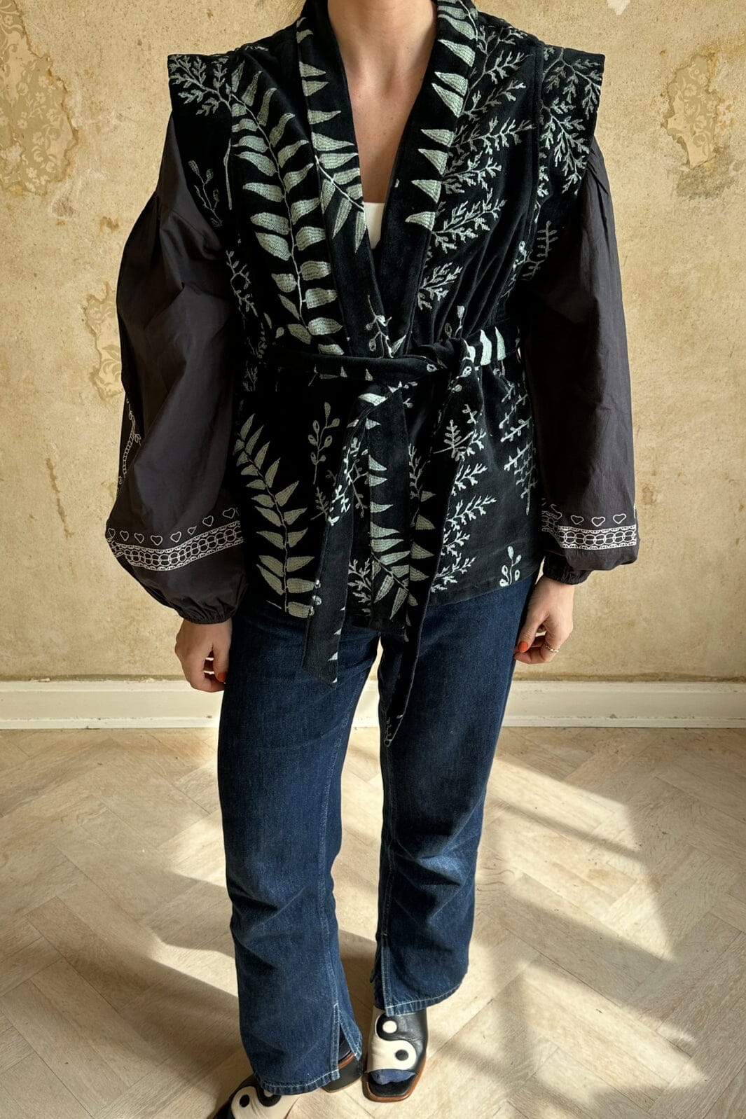 Mörk väst från Sissel Edelbo i ekologisk bomull med broderade blad. Den har breda axlar, sidfickor och ett avtagbart bälte. Fodrad inuti med handgjord blocktryck.