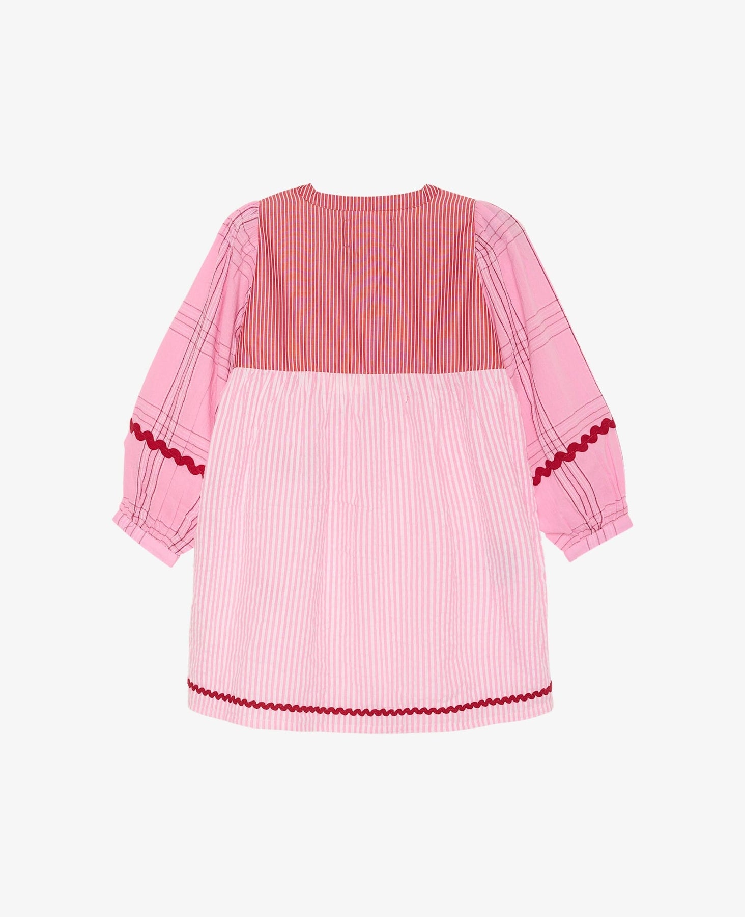 Miniklänning från Sissel Edelbo i rosa och röd med ränder. Klänningen har handgjorda detaljer som volanger, rosetter och broderi samt långa ballongärmar med zigzagband.