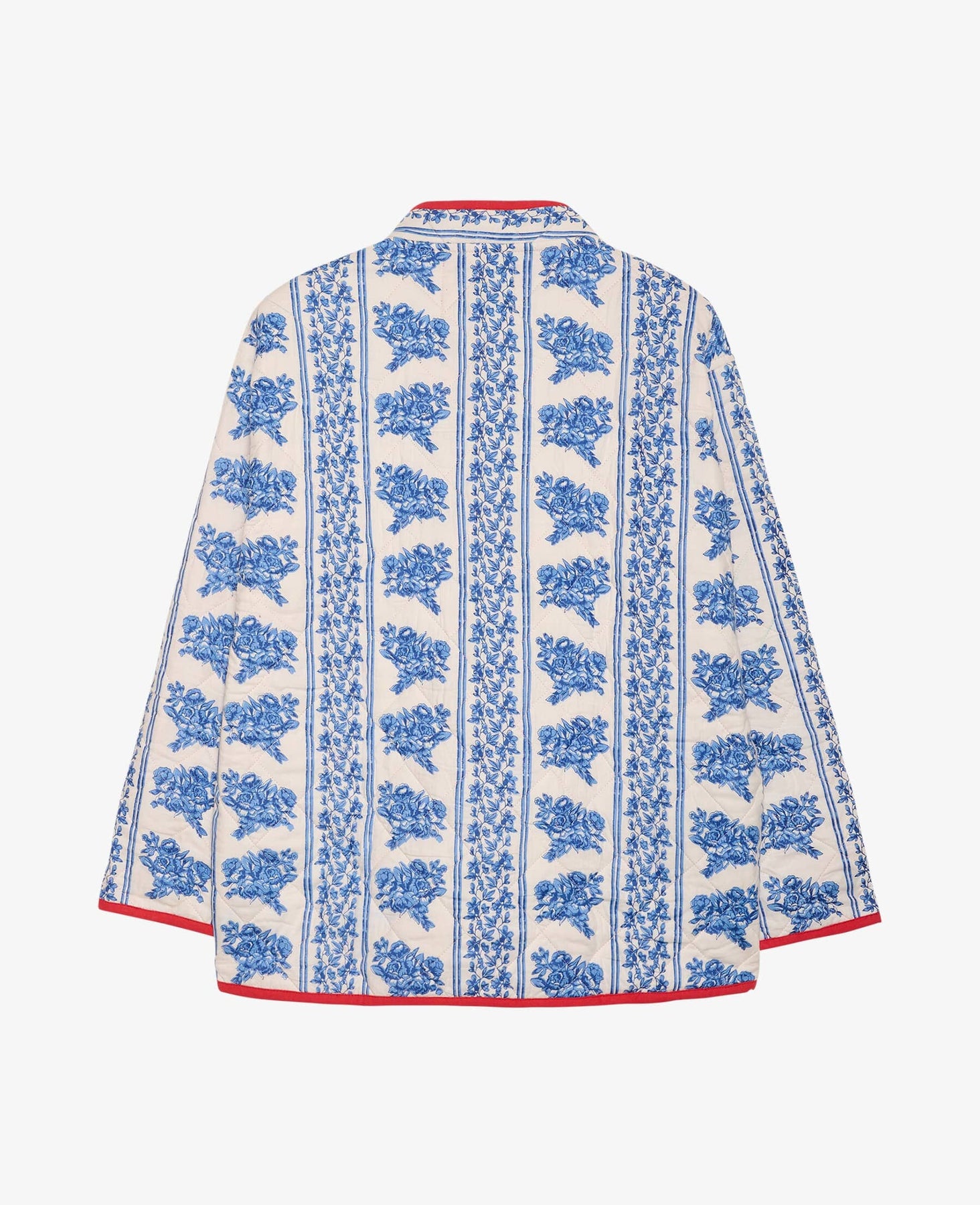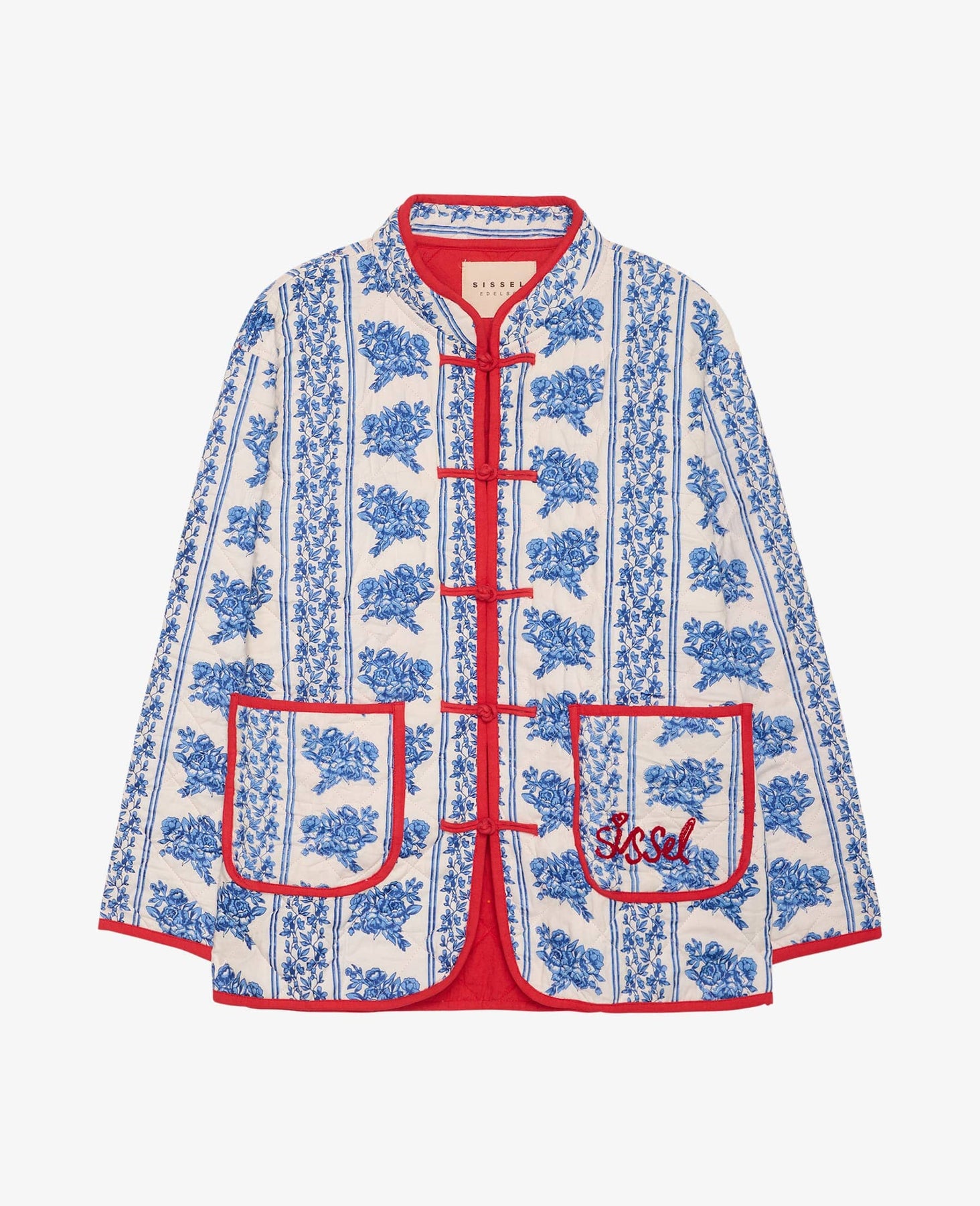 Jacka från Sissel Edelbo med blått blommönster på vit bakgrund. Jackan har röda kanter längs framtill och fickorna.
