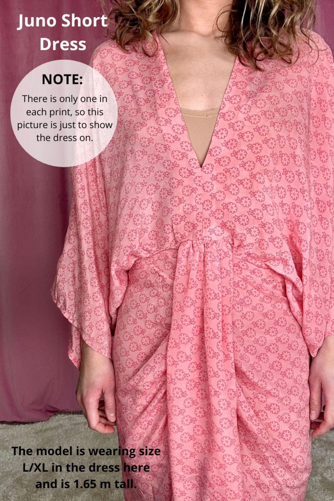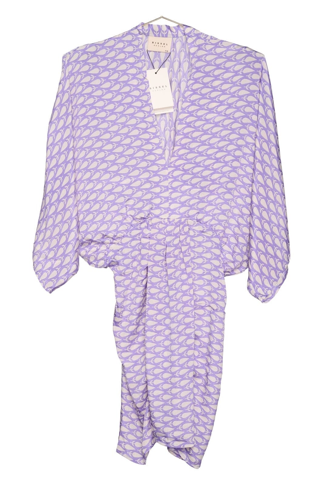 Kort klänning från Sissel Edelbo i lila och vitt mönster med V-ringning. Klänningen har fjärilsärmar och resår i midjan, vilket ger form åt silhuetten.