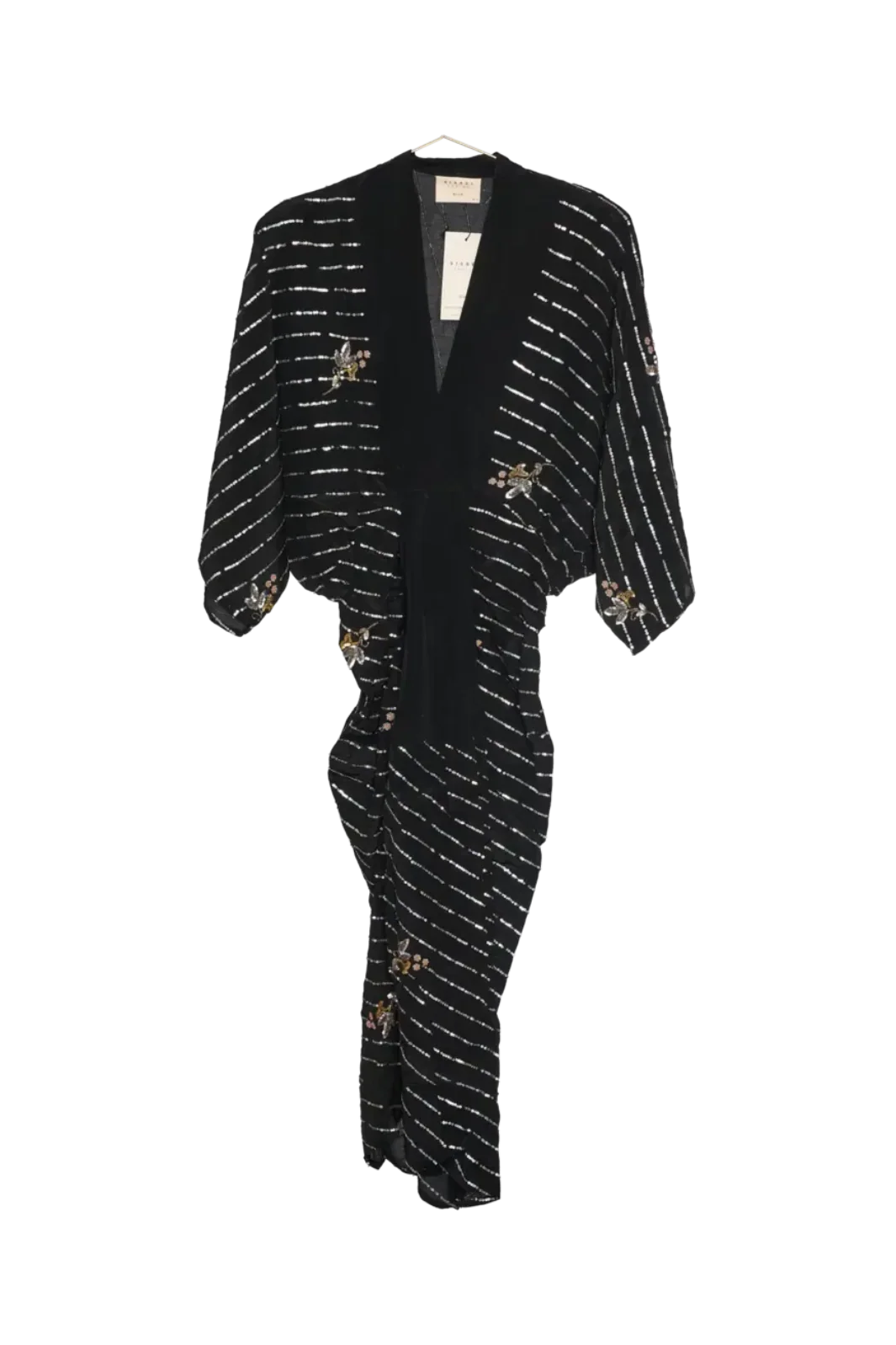 Svart silkeklänning från Sissel Edelbo med vita diagonala ränder och blommotiv. Klänningen är sydd av återvunna silkesarier med pärlor och paljetter som dekoration.