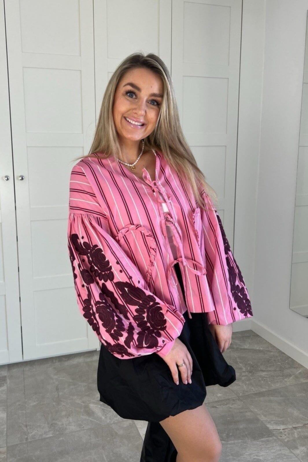 Randig topp från Sissel Edelbo i ekologisk bomull. Den rosa toppen har bordeauxfärgade blommönster på ärmarna och tre uppsättningar snörningar fram.