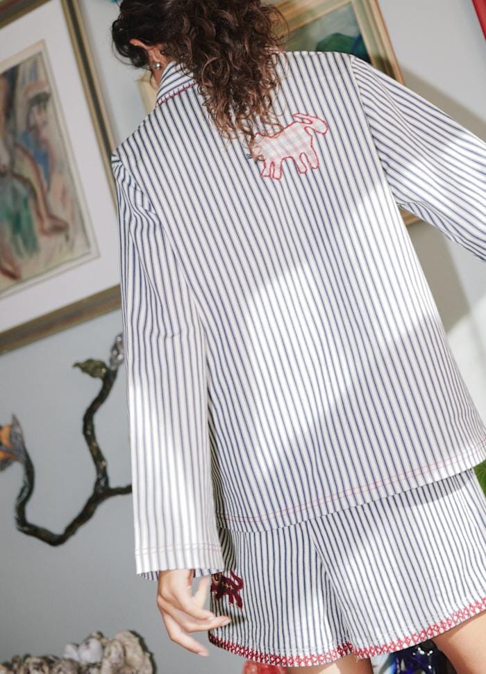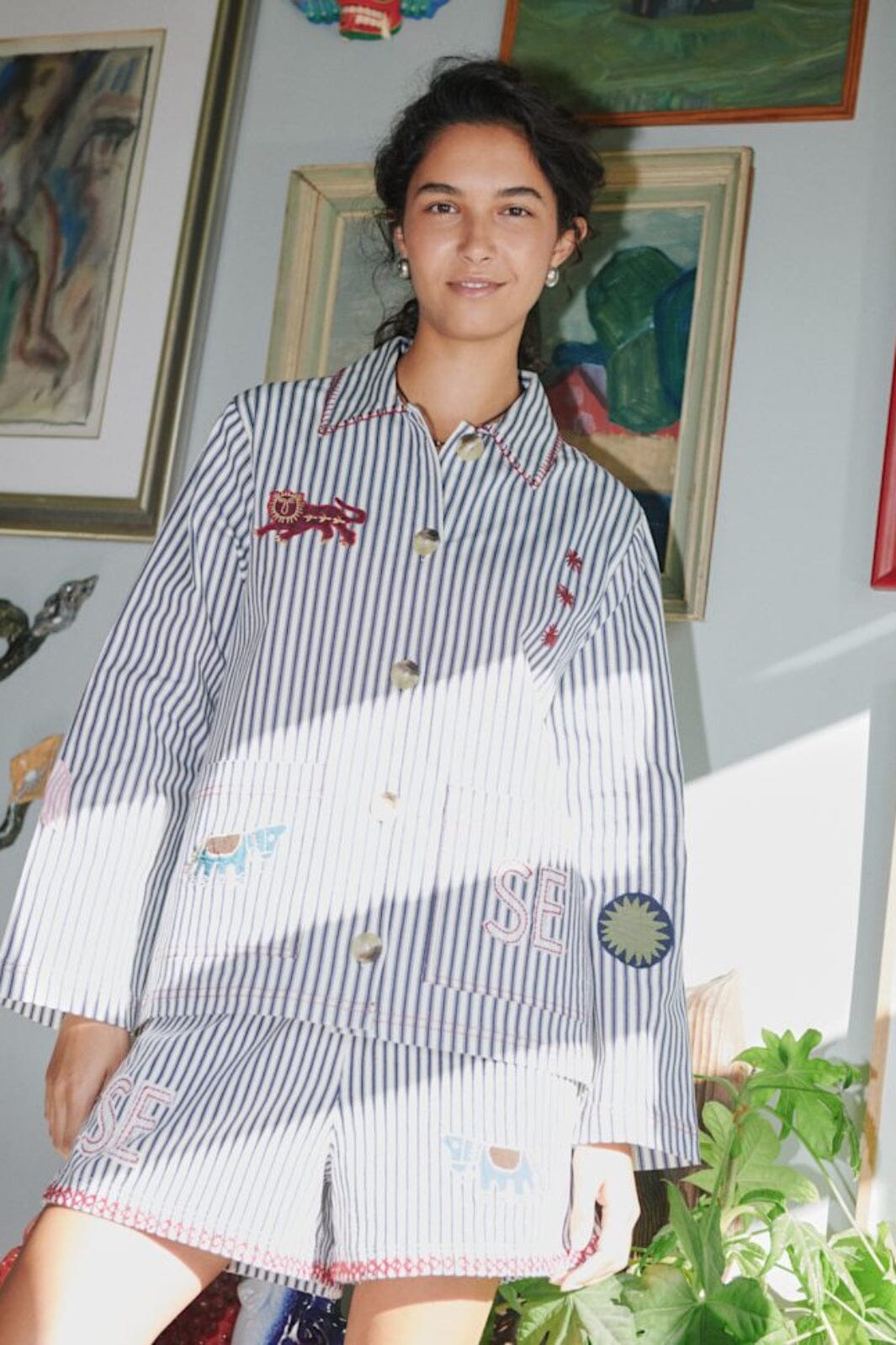 Randig jacka från Sissel Edelbo med broderade motiv som sol, tiger och häst. Jackan är tillverkad av överskottsbomullscanvas med 3 % stretch.