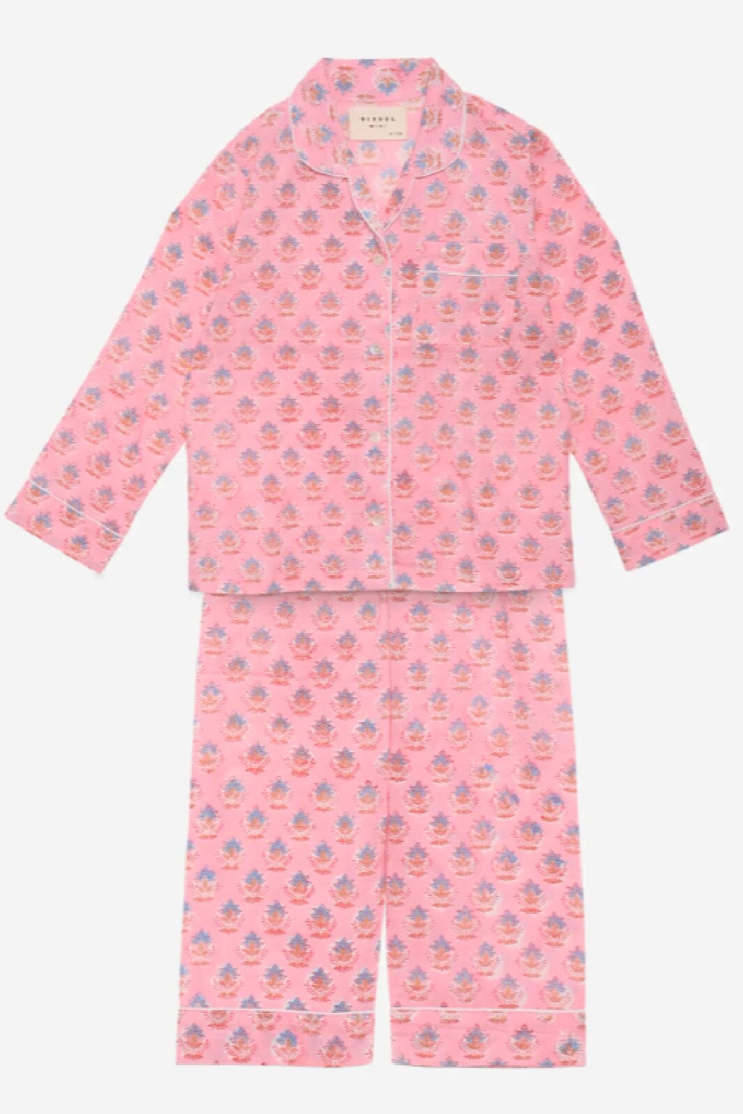 Rosa pyjamas från Sissel Edelbo med blommönster i blå och lila nyanser. Setet består av en långärmad skjorta med Peter Pan-krage och matchande byxor.