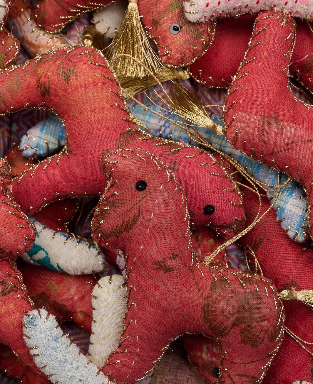 Gungande häst-ornament från Sissel Edelbo, tillverkat av rester från kantha-täcken. Varje ornament har en röd kropp med vit botten och gyllene tofs.