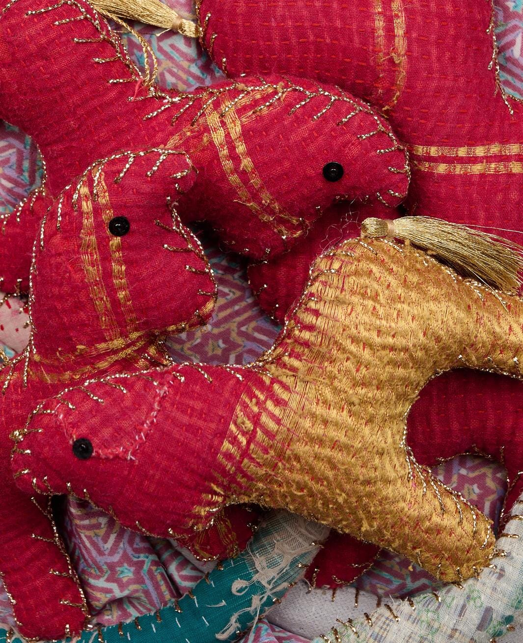 Gungande häst-ornament från Sissel Edelbo, tillverkad av rester från kantha-täcken. Ornamentet är gjort av upcyclade bomullssarier från Indien med kantha-broderiteknik.