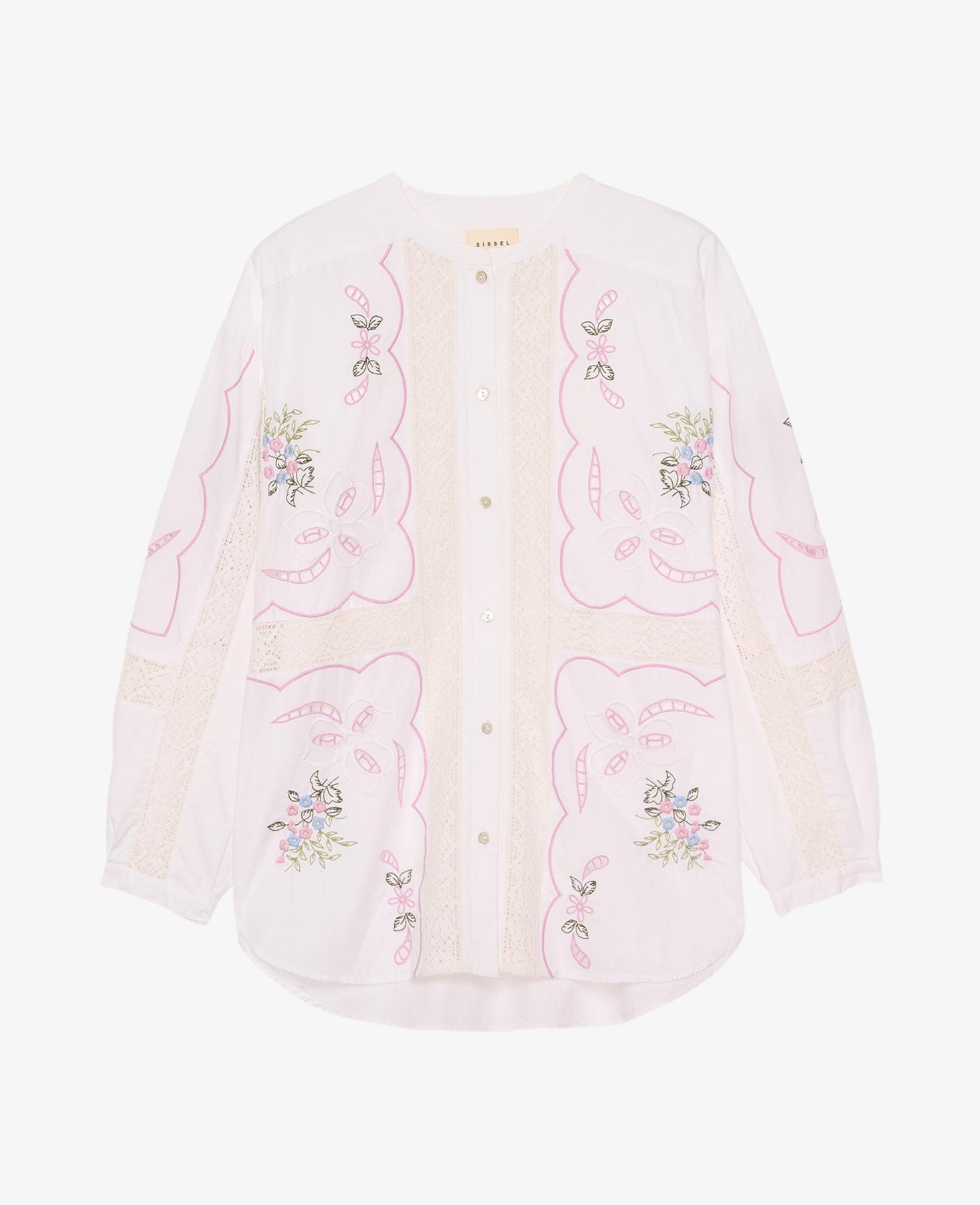 Vit skjorta från Sissel Edelbo med broderade blommotiv i pastellfärger och spetsdetaljer. Skjortan har en lös passform och är tillverkad av ekologisk bomull.