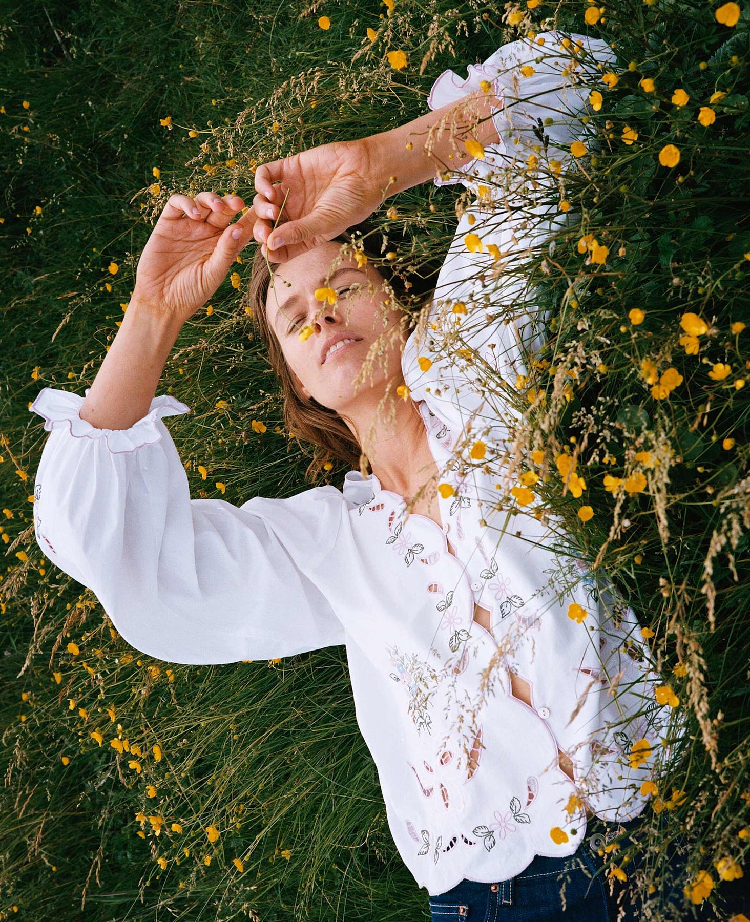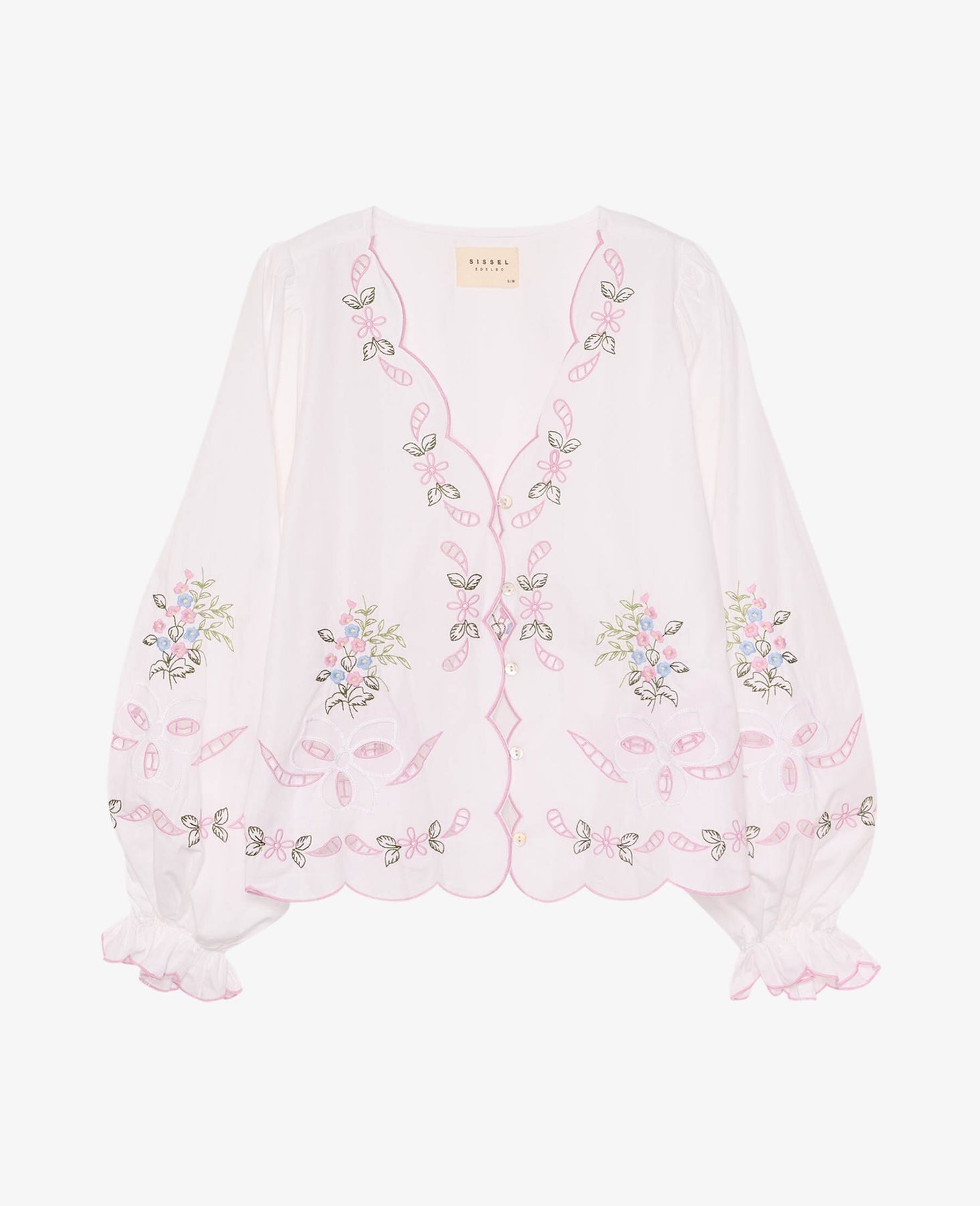 Vit topp från Sissel Edelbo med pastellfärgat blombroderi framtill och på ärmarna. Toppen har en lös passform och långa ärmar.