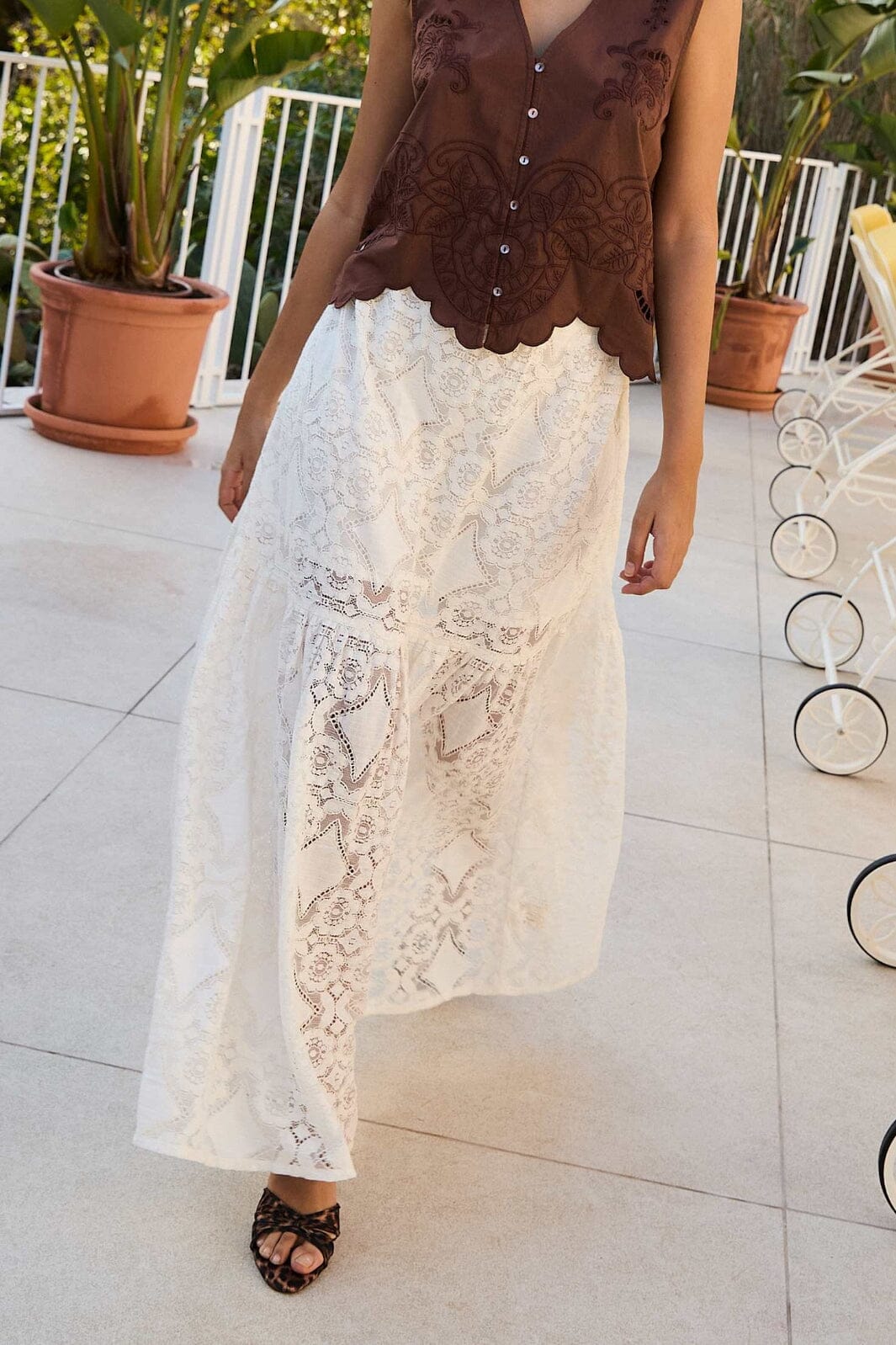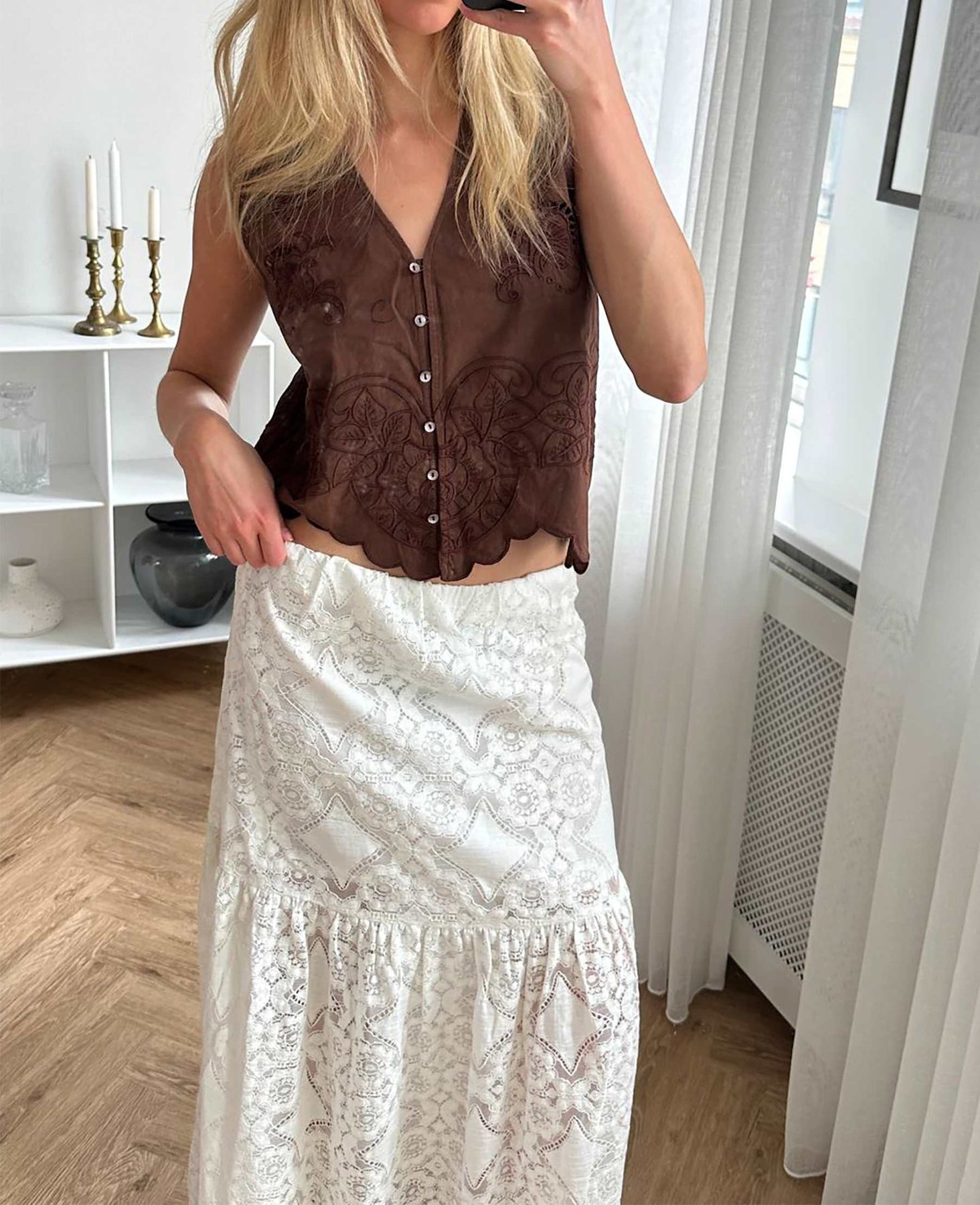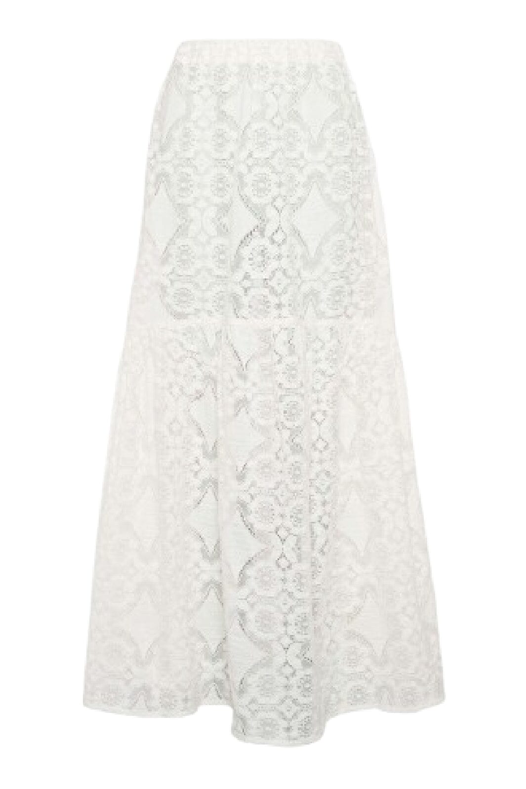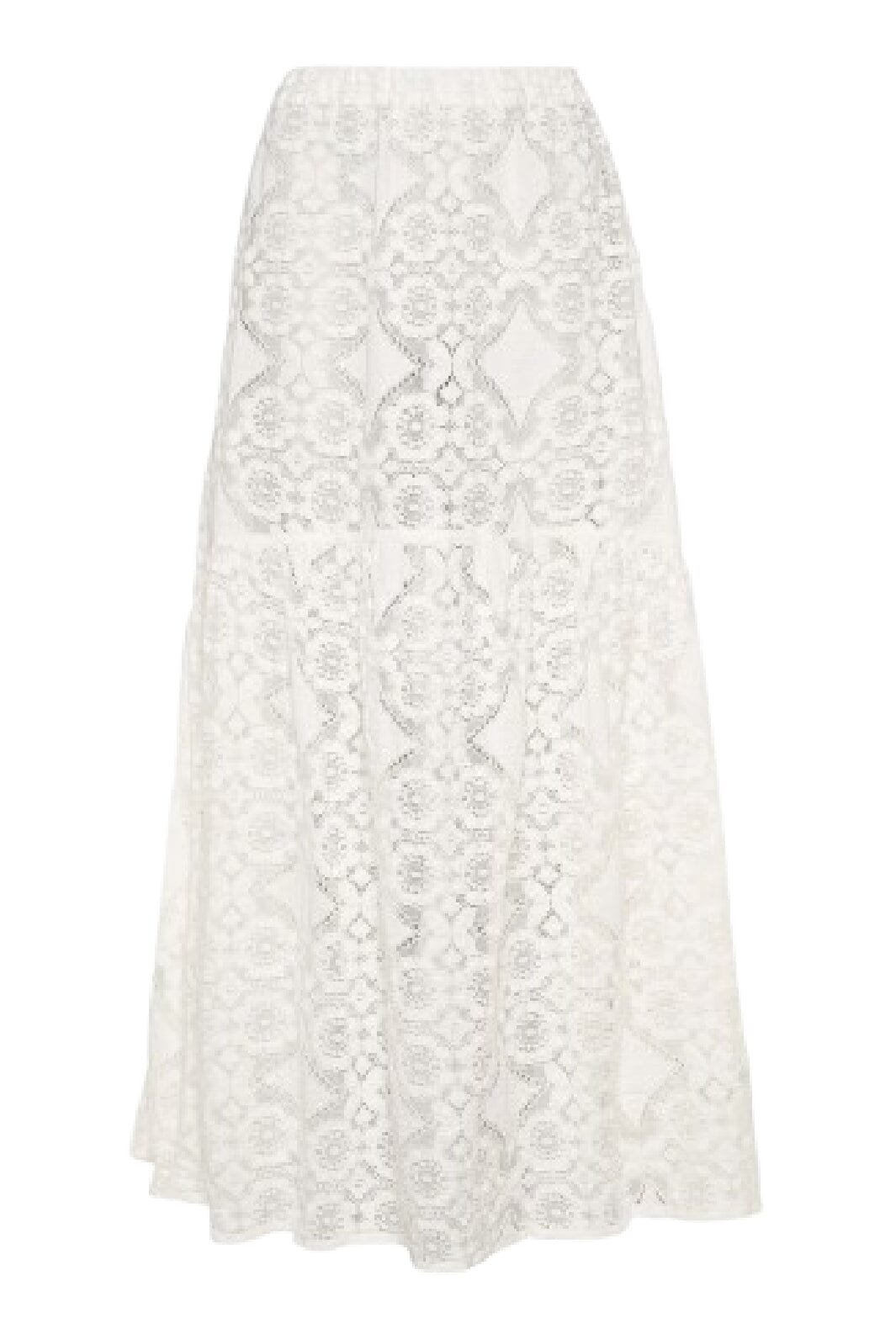 Lång kjol från Sissel Edelbo i vit broderie anglaise. Kjolen har en lös passform med elastik i midjan och en böjd söm som ger den form.