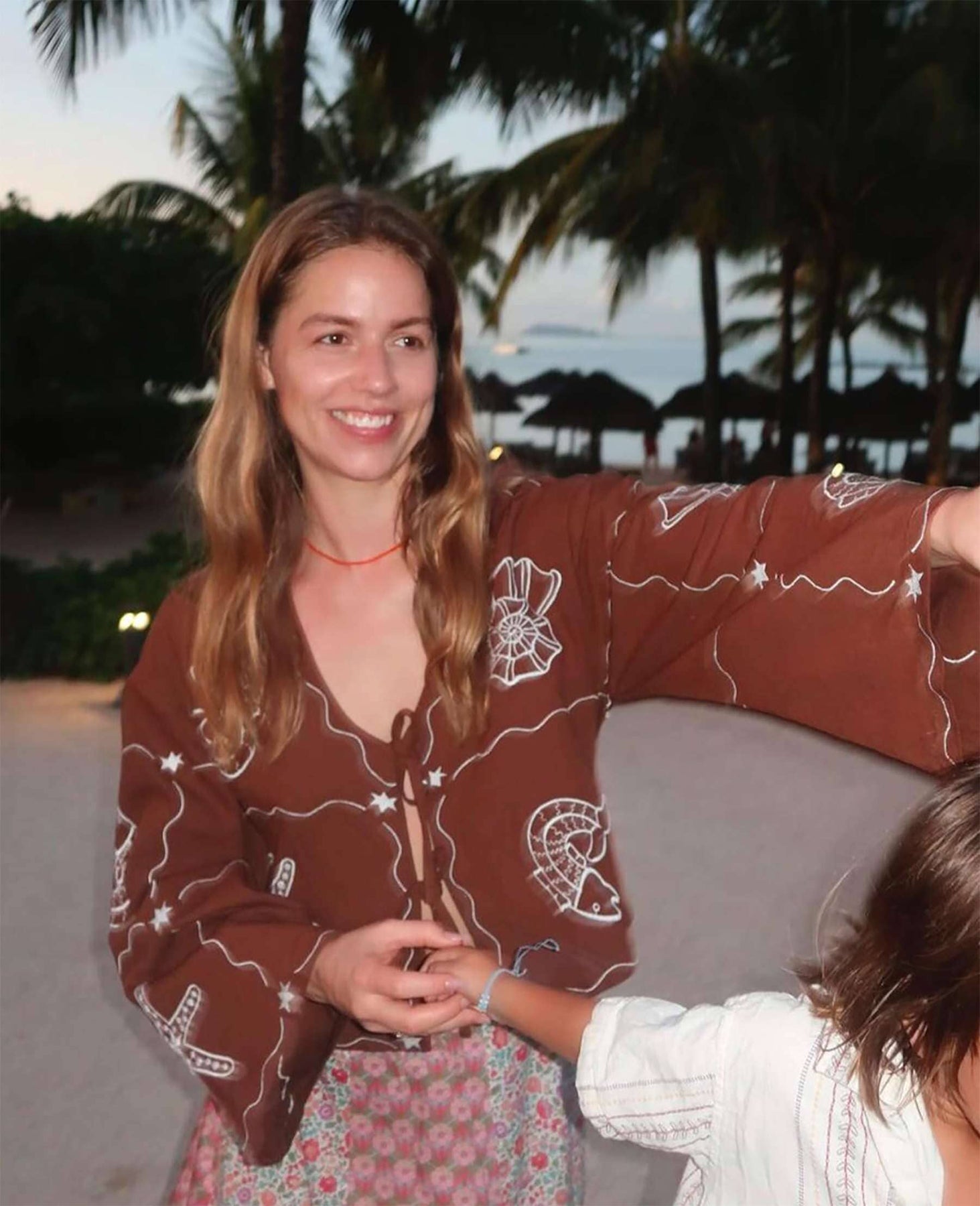 Brun topp från Sissel Edelbo i ekologisk bomull. Toppen har vita broderier av snäckor, stjärnor och fiskar. Den kommer med V-ringning och två uppsättningar snören fram.