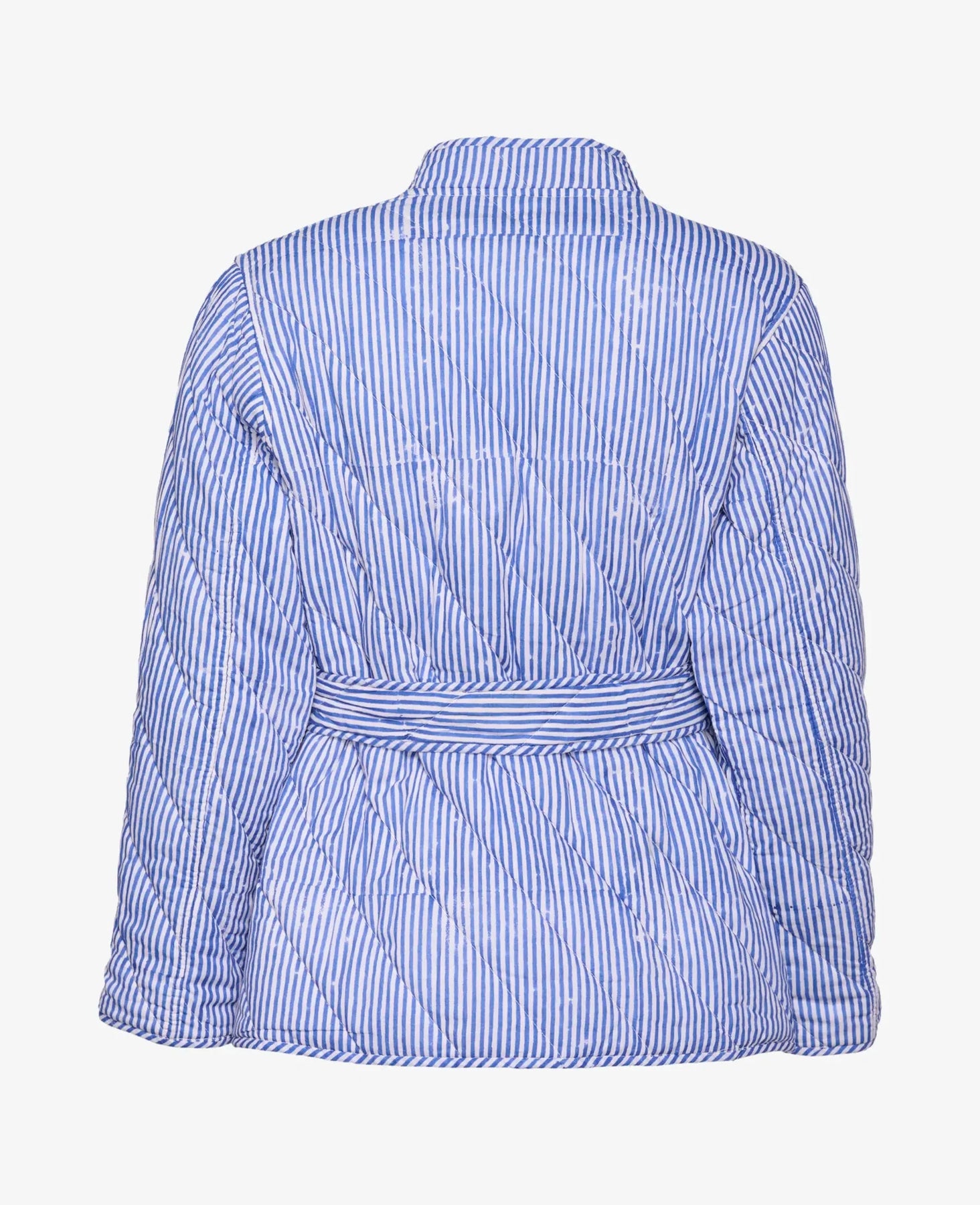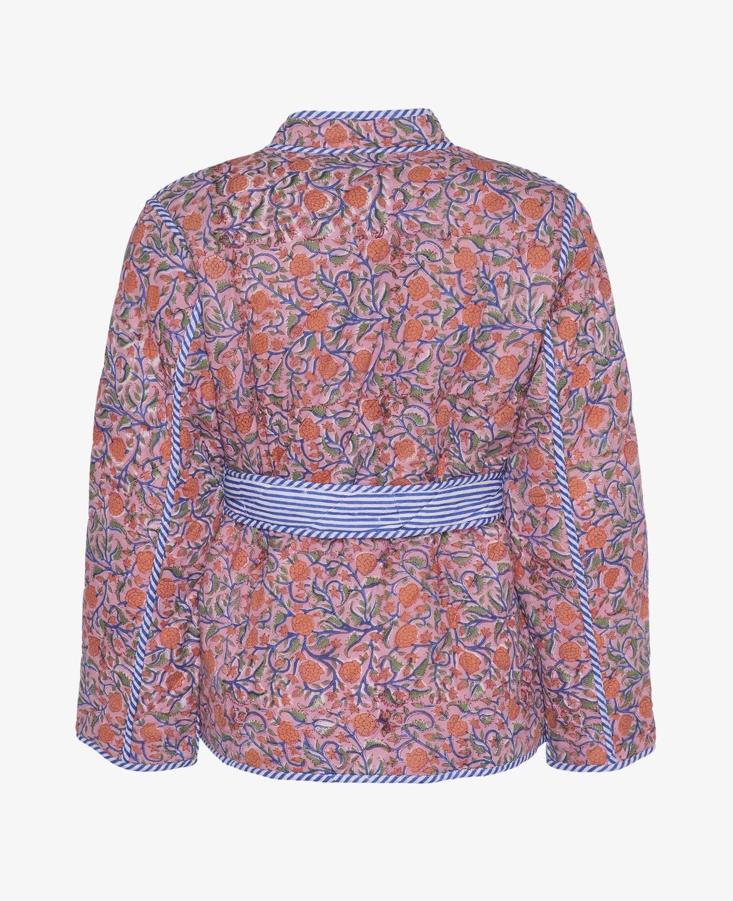 Vändbar jacka från Sissel Edelbo i ekologisk bomull. Den har ett blommönster i orange och rosa nyanser på ena sidan och en blårandig design på den andra sidan.