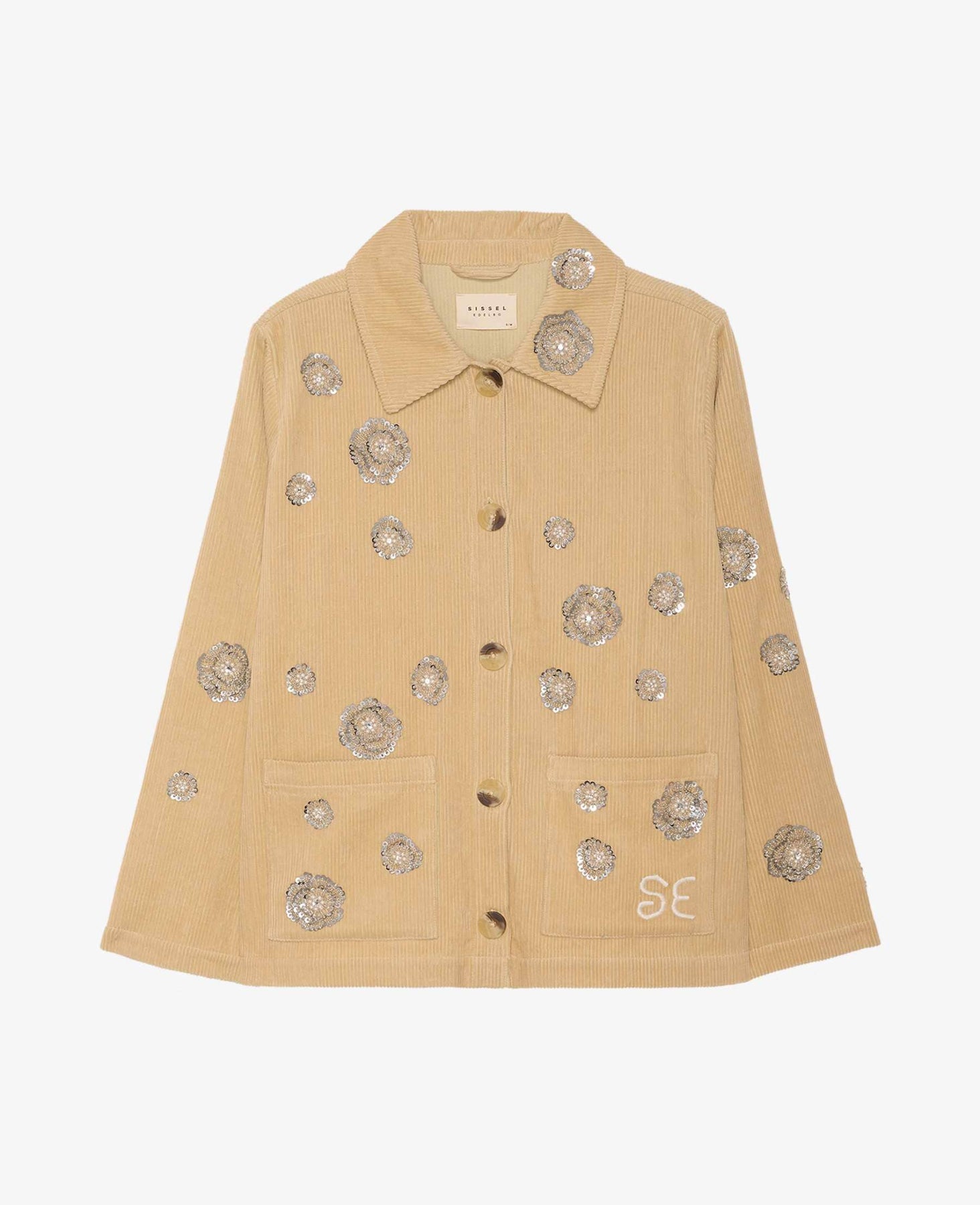 Beige jacka från Sissel Edelbo, tillverkad av överbliven manchester. Jackan har paljetter och pärlrosetter i olika storlekar, arrangerade i ett oregelbundet mönster.