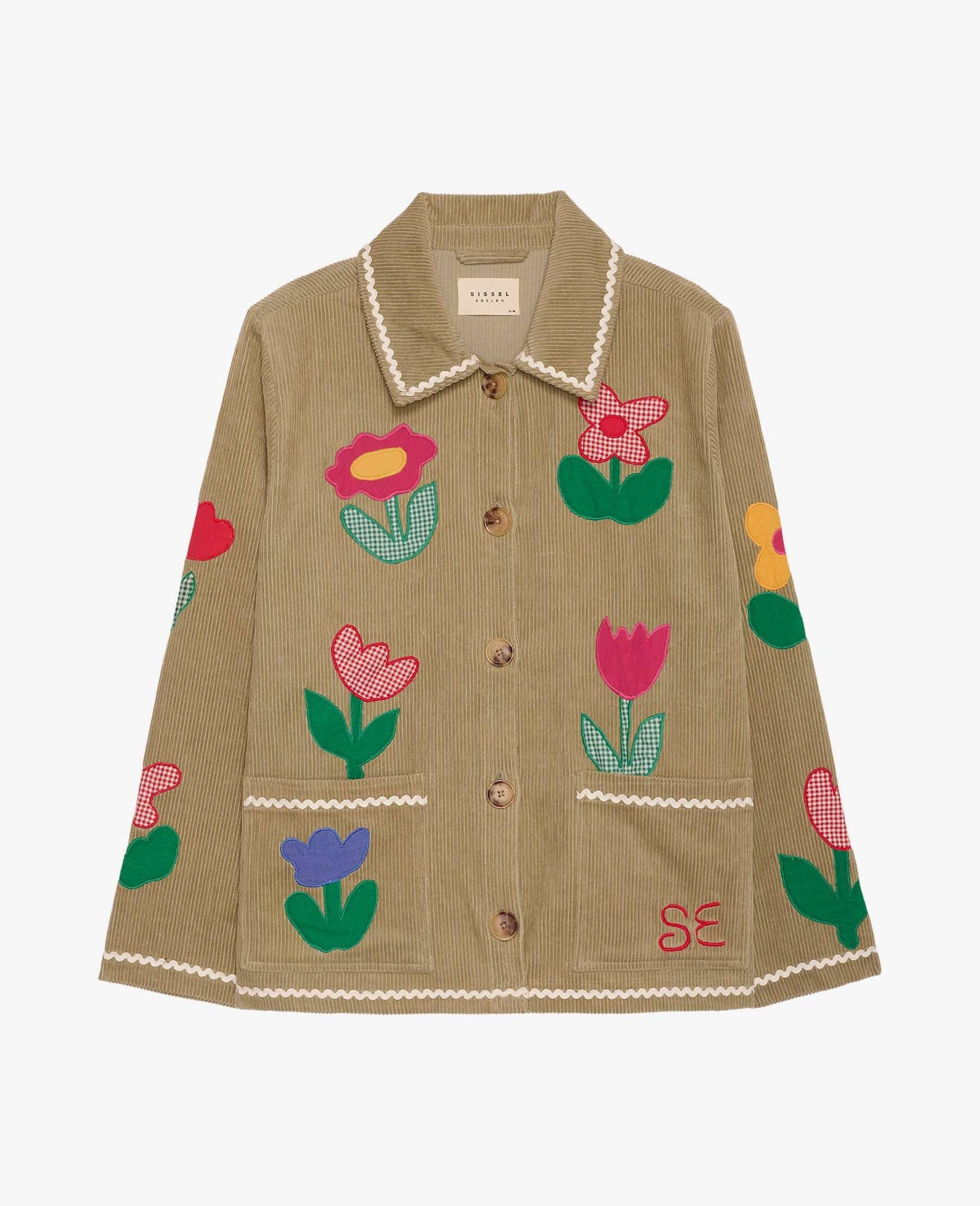 Jacka från Sissel Edelbo, tillverkad av överbliven manchester i en grön nyans. Jackan har en lös passform med liten skjortkrage och långa ärmar.