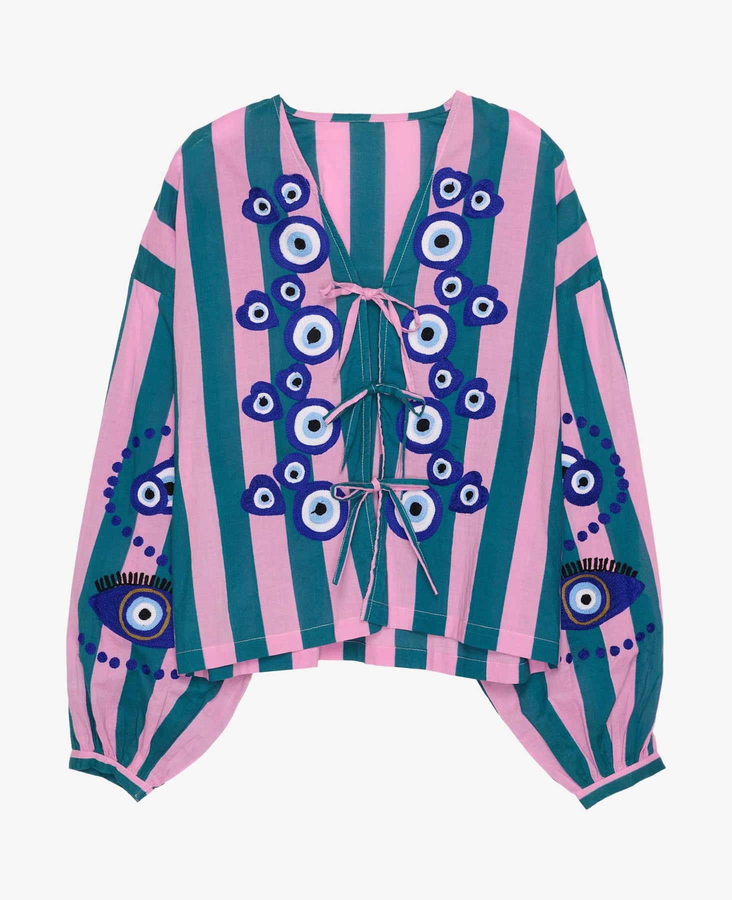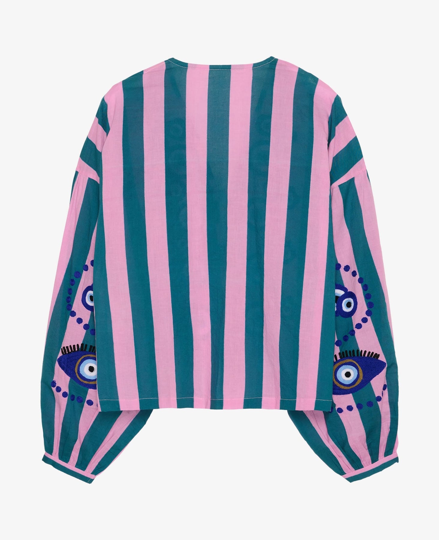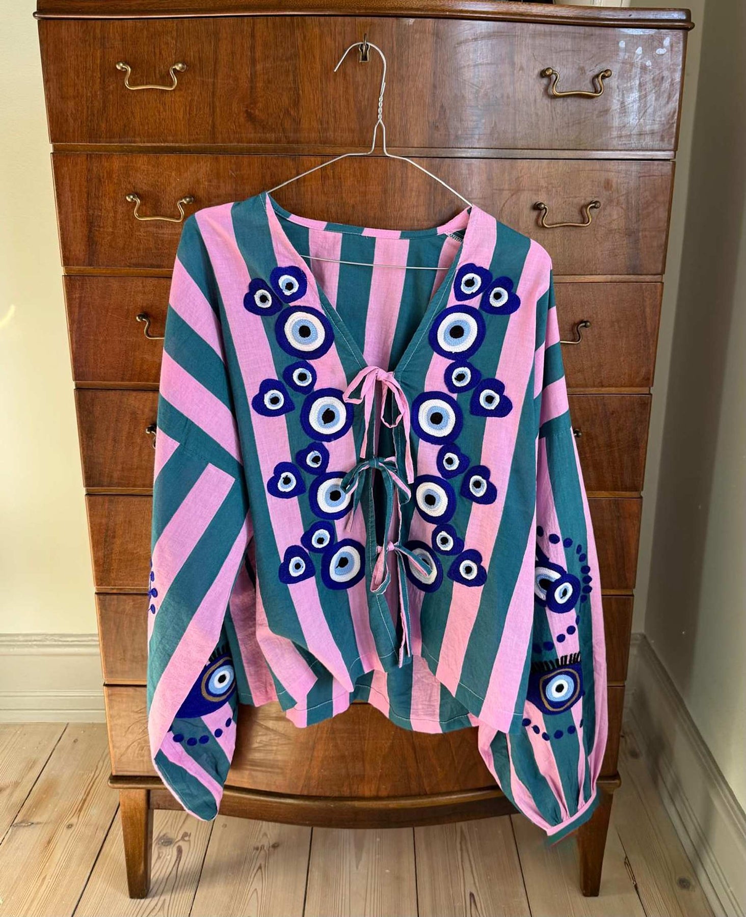 Top från Sissel Edelbo med ränder i rosa och petrolgrön. Toppen har runda, öga-liknande mönster och tre snören framtill.