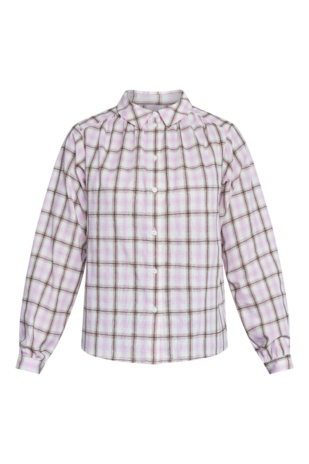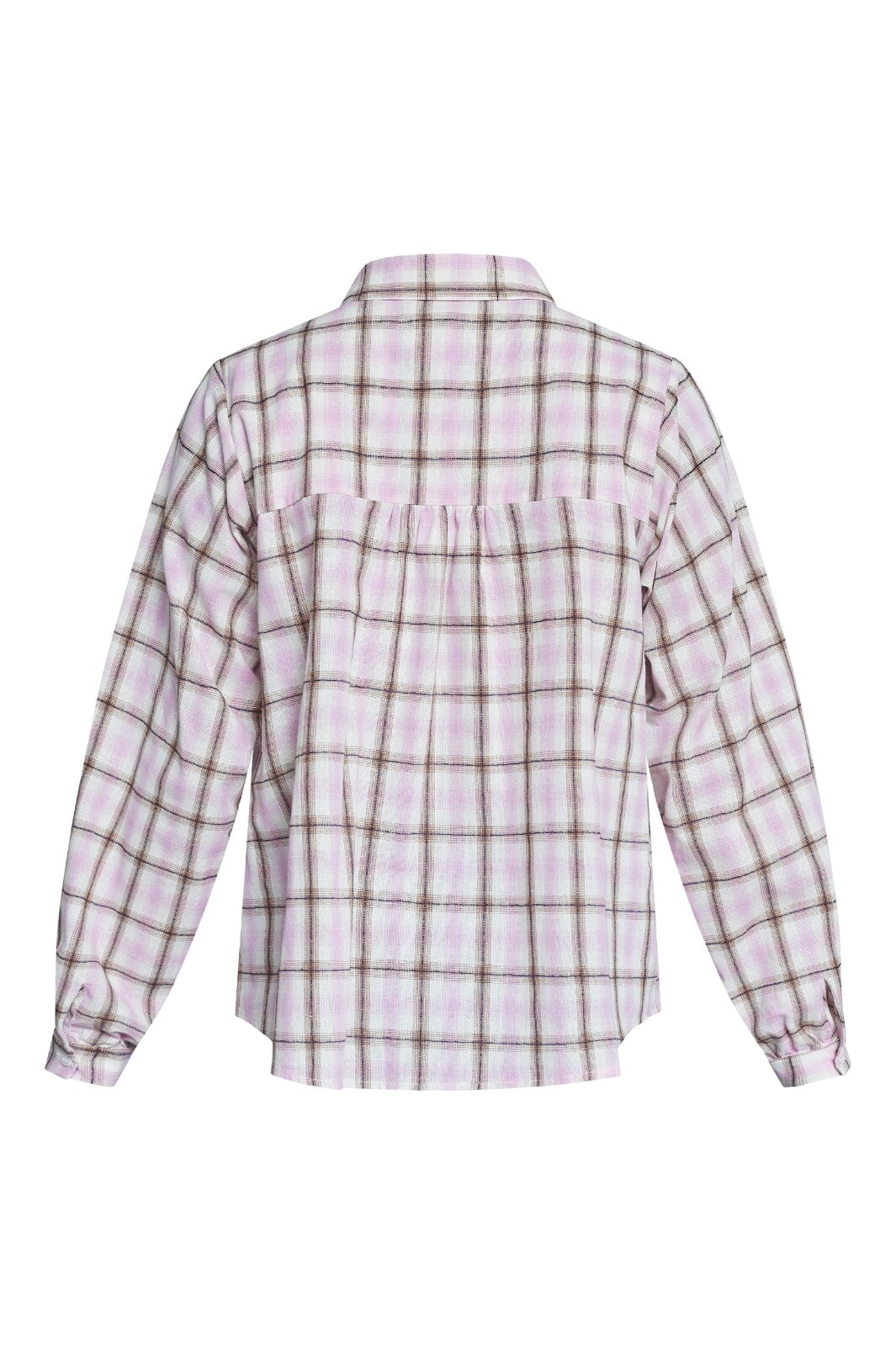 Skjorta från Sisters Point i rosa rutigt. Den har en klassisk krage och långa ärmar med rynkdetaljer vid axlarna. Skjortan knäpps med knappar hela vägen fram.