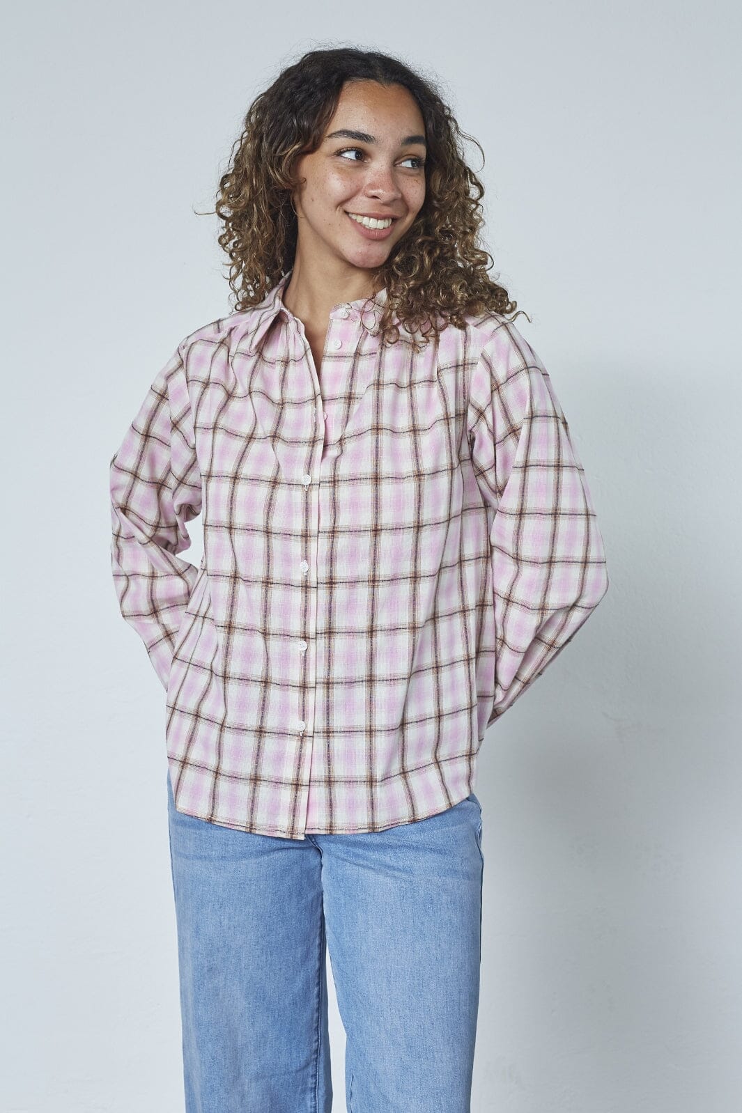 Skjorta från Sisters Point i rosa rutigt. Den har en klassisk krage och långa ärmar med rynkdetaljer vid axlarna. Skjortan knäpps med knappar hela vägen fram.