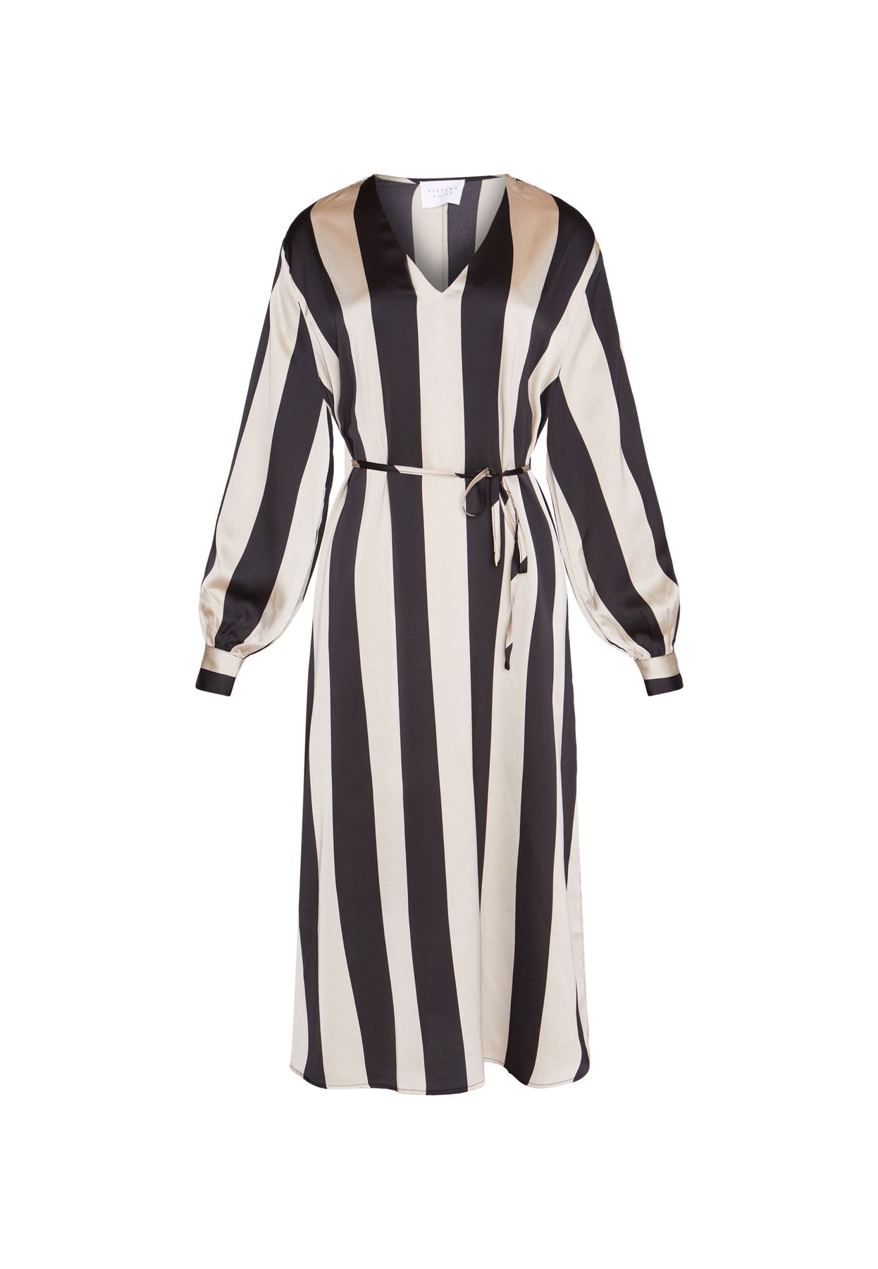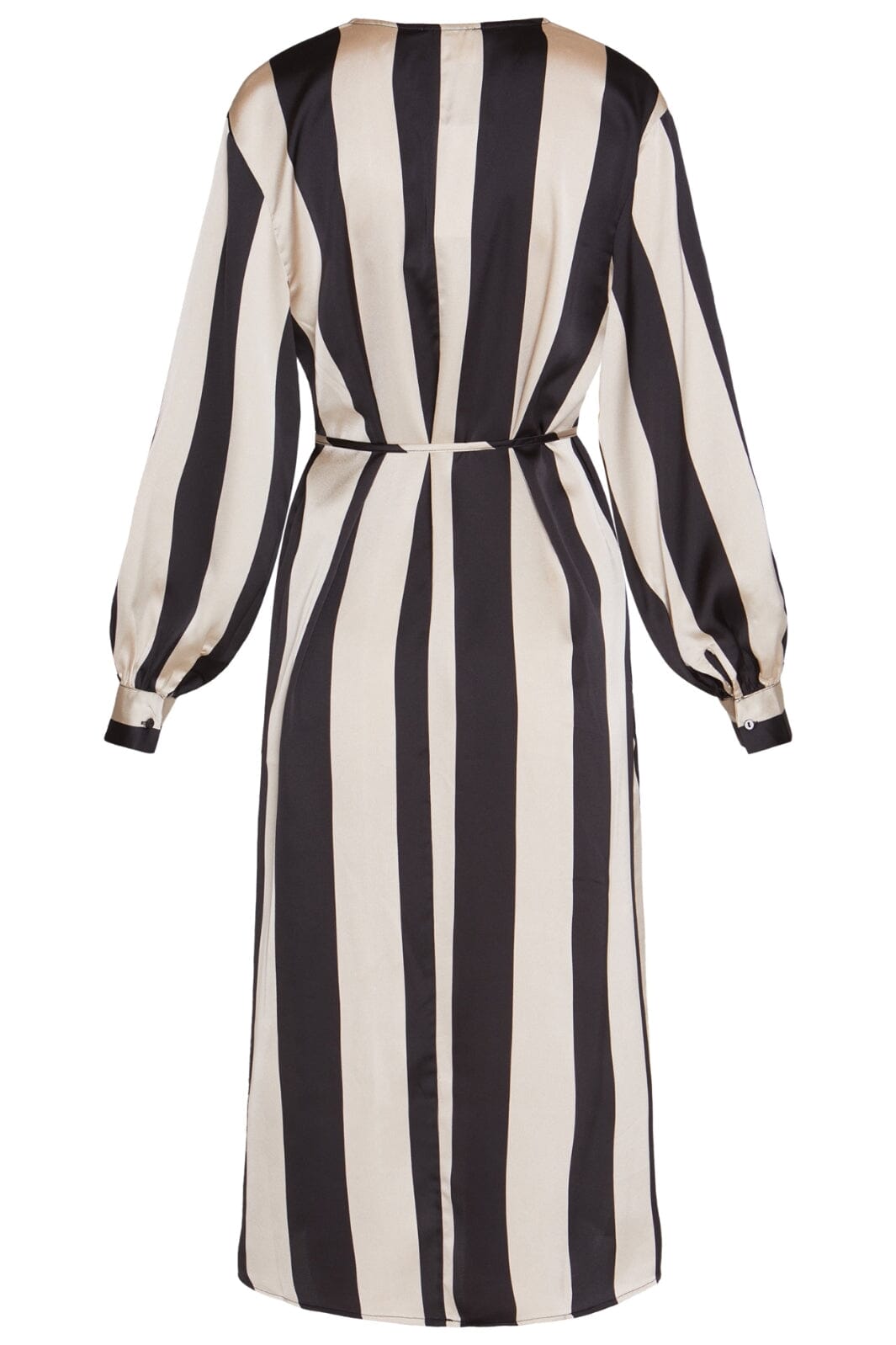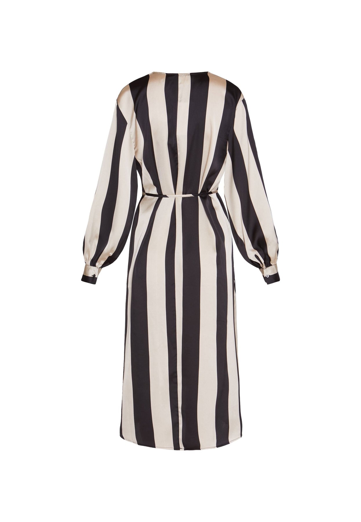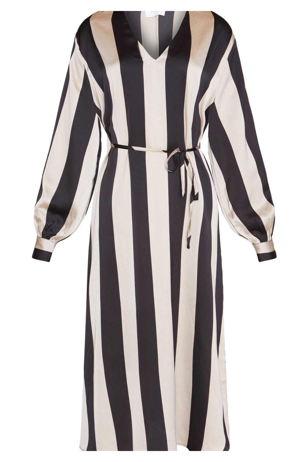 Lång klänning med ett avtagbart bälte i midjan. Klänningen har en V-ringning och är åtsittande ned vid handlederna. Modellen är 177 cm lång och har storlek S på.