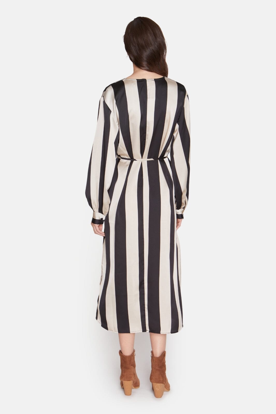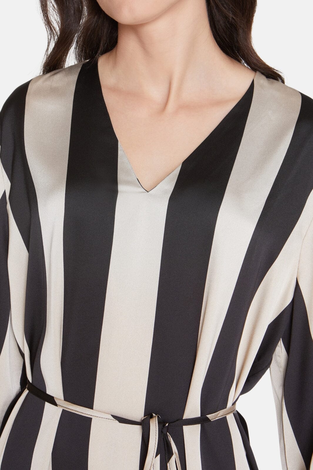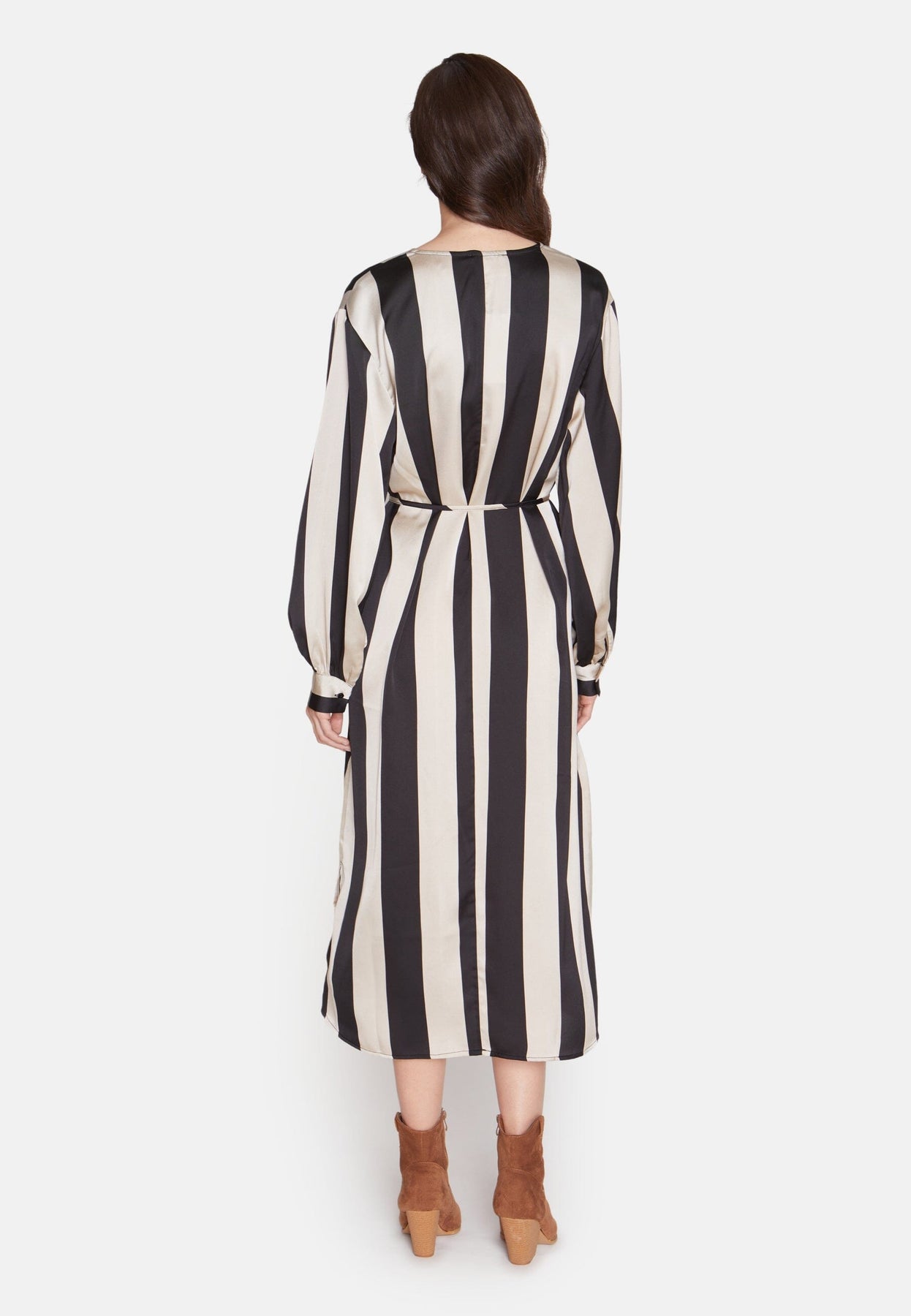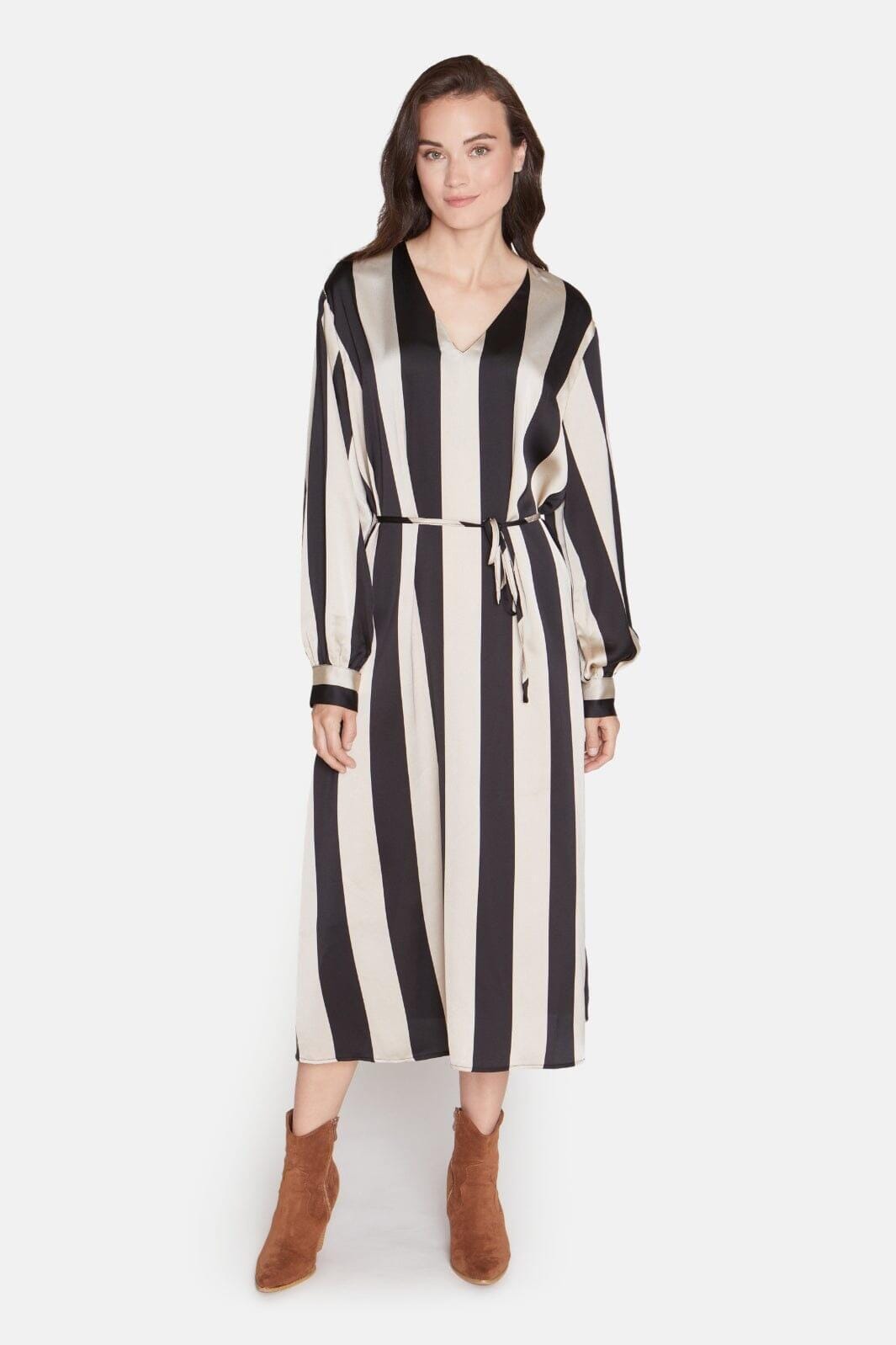 Lång klänning med ett avtagbart bälte i midjan. Klänningen har en V-ringning och är åtsittande ned vid handlederna. Modellen är 177 cm lång och har storlek S på.